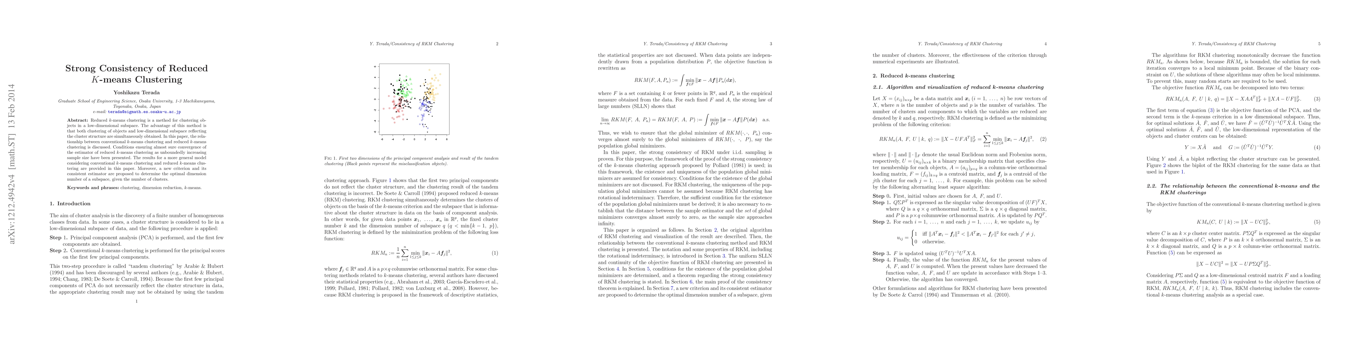 This paper explores the strong consistency of reduced k-means clustering, comparing it to conventional k-means clustering and presenting conditions for its almost sure convergence. It also introduces a new criterion for determining the optimal subspace dimension based on the number of clusters.