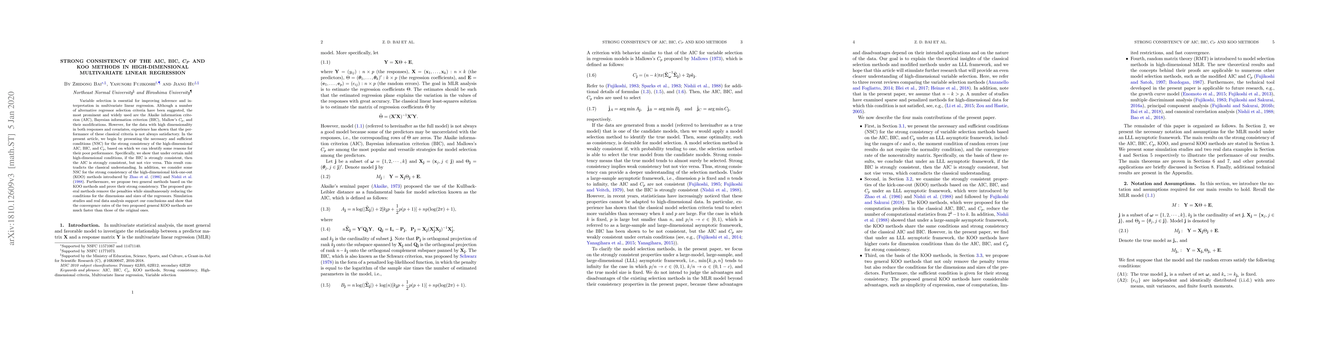 Variable selection is essential for improving inference and interpretation in multivariate linear regression. Although a number of alternative regressor selection criteria have been suggested, the most prominent and widely used are the Akaike information criterion (AIC), Bayesian information criterion (BIC), Mallow's $C_p$, and their modifications. However, for high-dimensional data, experience has shown that the performance of these classical criteria is not always satisfactory. In the present article, we begin by presenting the necessary and sufficient conditions (NSC) for the strong consistency of the high-dimensional AIC, BIC, and $C_p$, based on which we can identify some reasons for their poor performance. Specifically, we show that under certain mild high-dimensional conditions, if the BIC is strongly consistent, then the AIC is strongly consistent, but not vice versa. This result contradicts the classical understanding. In addition, we consider some NSC for the strong consistency of the high-dimensional kick-one-out (KOO) methods introduced by Zhao et al. (1986) and Nishii et al. (1988). Furthermore, we propose two general methods based on the KOO methods and prove their strong consistency. The proposed general methods remove the penalties while simultaneously reducing the conditions for the dimensions and sizes of the regressors. A simulation study supports our consistency conclusions and shows that the convergence rates of the two proposed general KOO methods are much faster than those of the original methods.