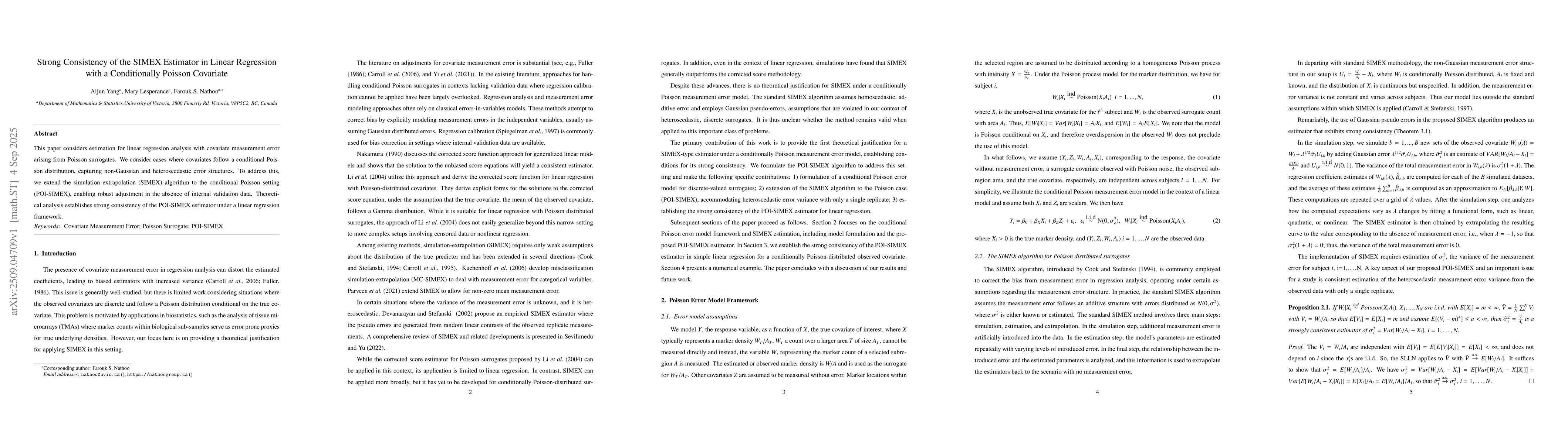 This paper considers estimation for linear regression analysis with covariate measurement error arising from Poisson surrogates. We consider cases where covariates follow a conditional Poisson distribution, capturing non-Gaussian and heteroscedastic error structures. To address this, we extend the simulation extrapolation (SIMEX) algorithm to the conditional Poisson setting (POI-SIMEX), enabling robust adjustment in the absence of internal validation data. Theoretical analysis establishes strong consistency of the POI-SIMEX estimator under a linear regression framework.