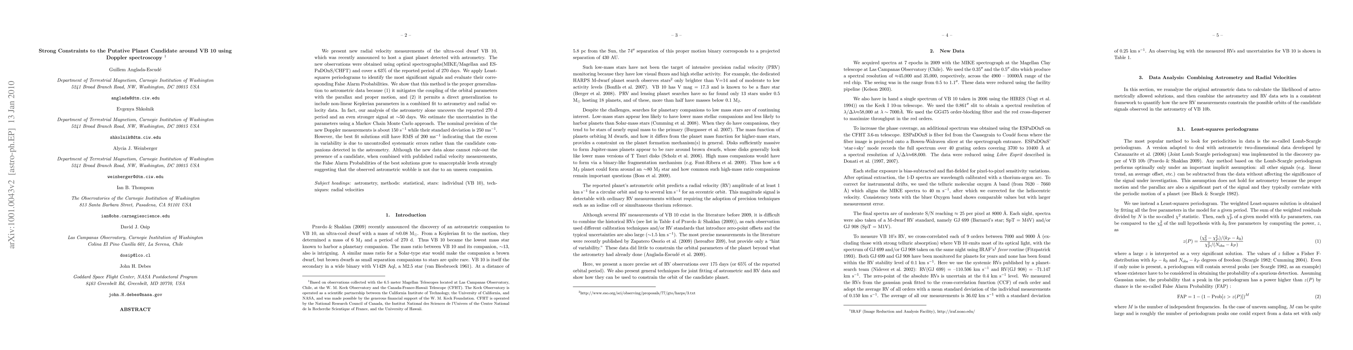 We present new radial velocity measurements of the ultra-cool dwarf VB 10, which was recently announced to host a giant planet detected with astrometry. The new observations were obtained using optical spectrographs(MIKE/Magellan and ESPaDOnS/CHFT) and cover a 63% of the reported period of 270 days. We apply Least-squares periodograms to identify the most significant signals and evaluate their corresponding False Alarm Probabilities. We show that this method is the proper generalization to astrometric data because (1) it mitigates the coupling of the orbital parameters with the parallax and proper motion, and (2) it permits a direct generalization to include non-linear Keplerian parameters in a combined fit to astrometry and radial velocity data. In fact, our analysis of the astrometry alone uncovers the reported 270 d period and an even stronger signal at 50 days. We estimate the uncertainties in the parameters using a Markov Chain Monte Carlo approach. The nominal precision of the new Doppler measurements is about 150 s$^{-1}$ while their standard deviation is 250 ms$^{-1}$. However, the best fit solutions still have RMS of 200 ms$^{-1}$ indicating that the excess in variability is due to uncontrolled systematic errors rather than the candidate companions detected in the astrometry. Although the new data alone cannot rule-out the presence of a candidate, when combined with published radial velocity measurements, the False Alarm Probabilities of the best solutions grow to unacceptable levels strongly suggesting that the observed astrometric wobble is not due to an unseen companion.
