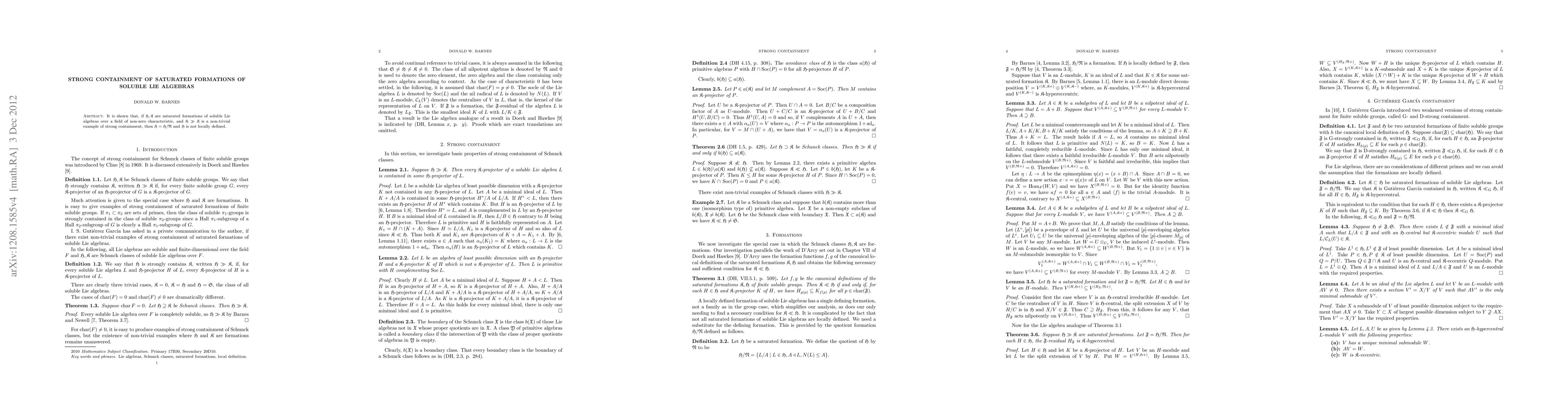 Summary: The research demonstrates that when H and K are saturated formations of soluble Lie algebras in non-zero characteristic fields, H strongly containing K nontrivially implies H equals the formation generated by L/N(L) for L in H and H is not locally defined.
