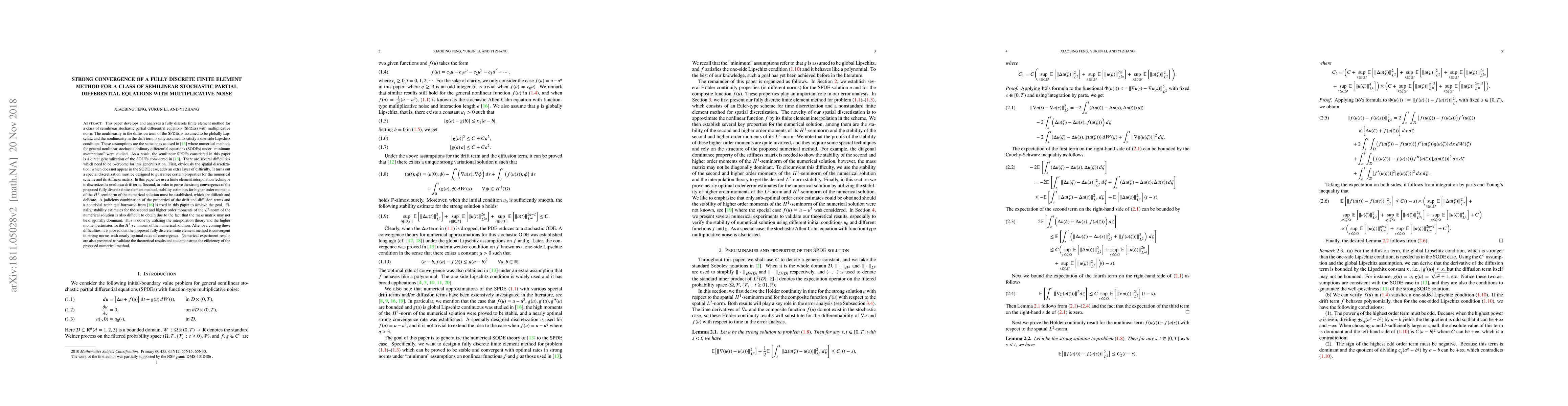 This paper develops a fully discrete finite element method for semilinear stochastic PDEs with multiplicative noise, addressing challenges in spatial discretization and establishing stability estimates for higher moments. The method achieves strong convergence with nearly optimal rates.