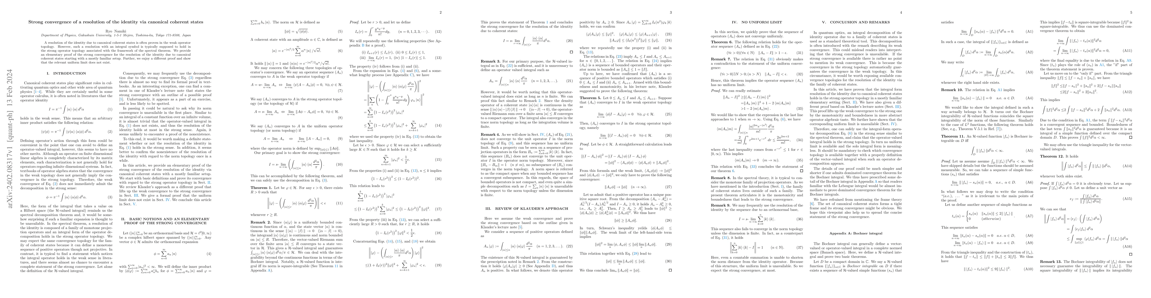 This paper provides an elementary proof of the strong convergence for a resolution of the identity via canonical coherent states, contrasting with the usual weak operator topology proofs. Additionally, it demonstrates that the relevant uniform limit does not exist.