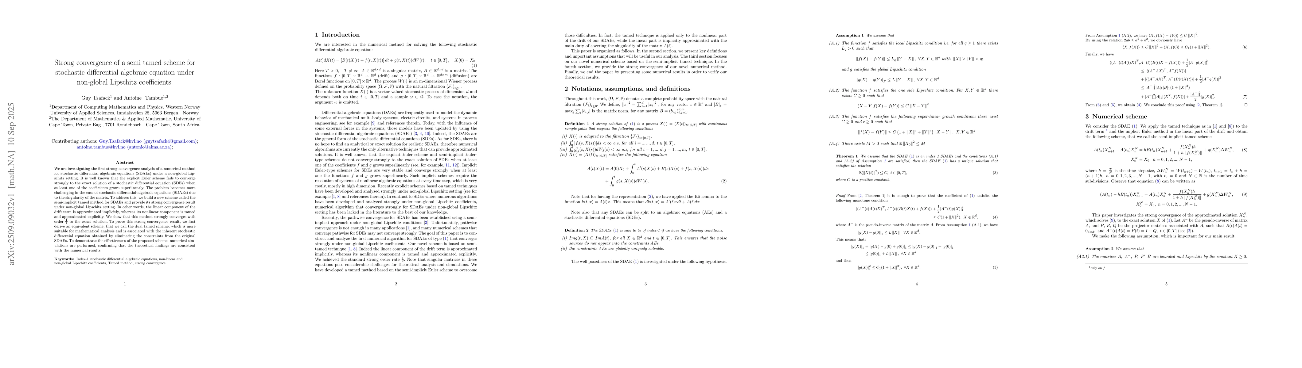 We are investigating the first strong convergence analysis of a numerical method for stochastic differential algebraic equations (SDAEs) under a non-global Lipschitz setting. It is well known that the explicit Euler scheme fails to converge strongly to the exact solution of a stochastic differential equation (SDEs) when at least one of the coefficients grows superlinearly. The problem becomes more challenging in the case of stochastic differential-algebraic equations (SDAEs) due to the singularity of the matrix. To address this, we build a new scheme called the semi-implicit tamed method for SDAEs and provide its strong convergence result under non-global Lipschitz setting. In other words, the linear component of the drift term is approximated implicitly, whereas its nonlinear component is tamed and approximated explicitly. We show that this method strongly converges with order $\frac{1}{2}$ to the exact solution. To prove this strong convergence result, we first derive an equivalent scheme, that we call the dual tamed scheme, which is more suitable for mathematical analysis and is associated with the inherent stochastic differential equation obtained by eliminating the constraints from the original SDAEs. To demonstrate the effectiveness of the proposed scheme, numerical simulations are performed, confirming that the theoretical findings are consistent with the numerical results.