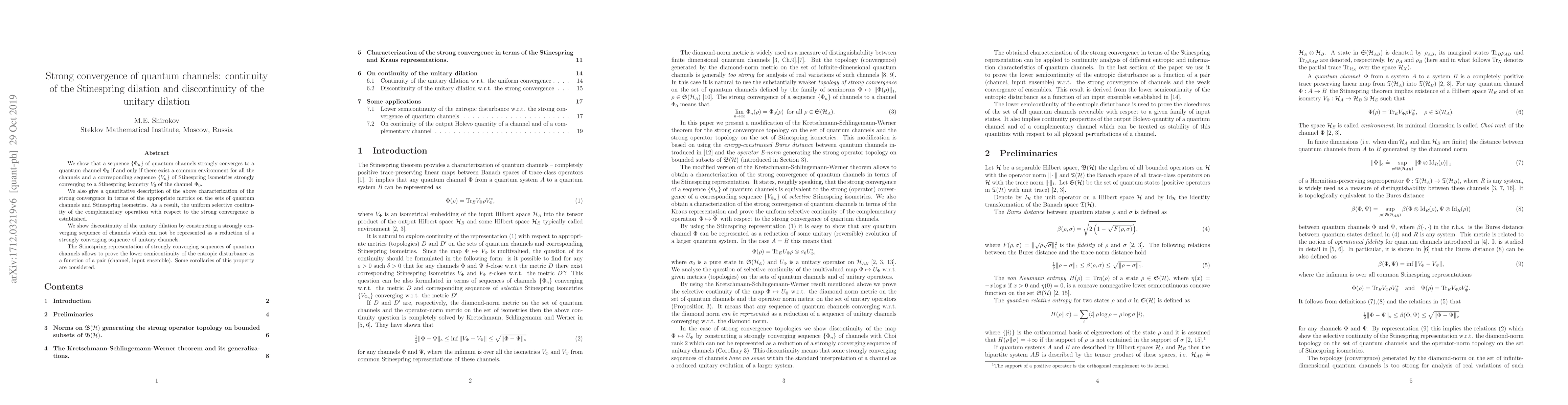This paper demonstrates the strong convergence of quantum channels through the continuity of the Stinespring dilation and shows the discontinuity of unitary dilation. It establishes a quantitative characterization of strong convergence in terms of metrics on quantum channels and Stinespring isometries, proving lower semicontinuity of entropic disturbance.