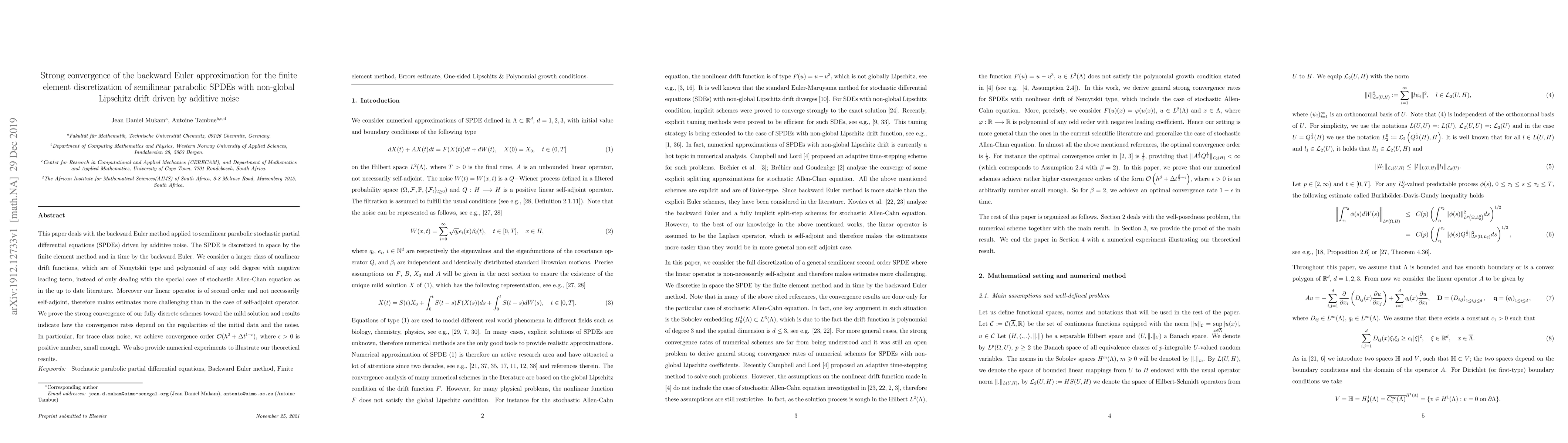 This paper deals with the backward Euler method applied to semilinear parabolic stochastic partial differential equations (SPDEs) driven by additive noise. The SPDE is discretized in space by the finite element method and in time by the backward Euler. We consider a larger class of nonlinear drift functions, which are of Nemytskii type and polynomial of any odd degree with negative leading term, instead of only dealing with the special case of stochastic Allen-Chan equation as in the up to date literature.Moreover our linear operator is of second order and not necessarily self-adjoint, therefore makes estimates more challenging than in the case of self-adjoint operator. We prove the strong convergence of our fully discrete schemes toward the mild solution and results indicate how the convergence rates depend on the regularities of the initial data and the noise. In particular, for trace class noise, we achieve convergence order $\mathcal{O} (h^{2}+\Delta t^{1-\epsilon})$, where $\epsilon>0$ is positive number, small enough. We also provide numerical experiments to illustrate our theoretical results.