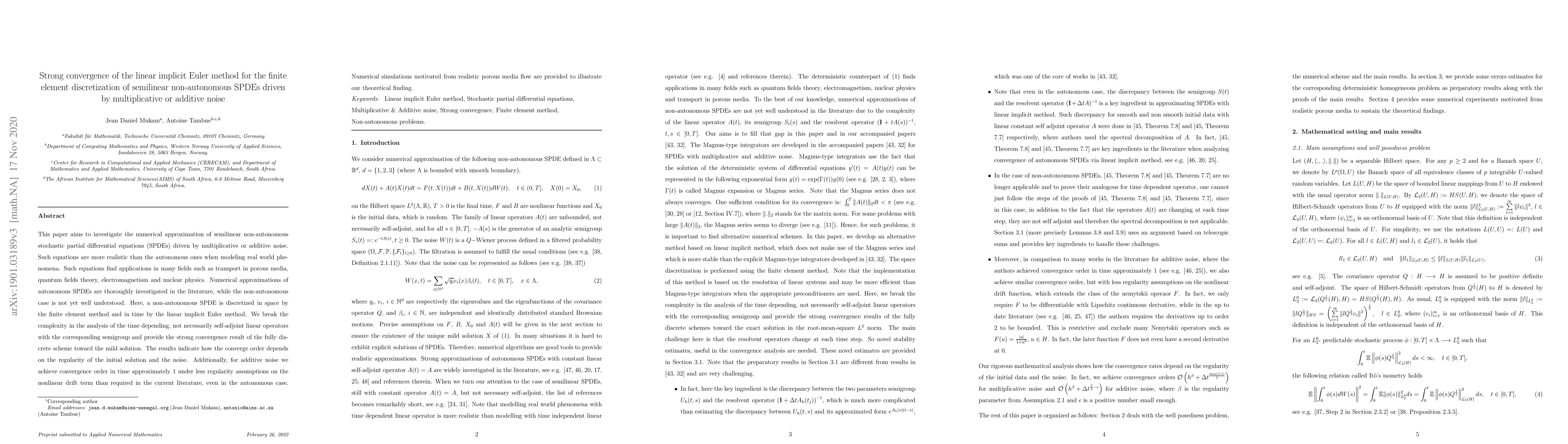 This paper studies the strong convergence of the linear implicit Euler method for finite element discretization of semilinear non-autonomous SPDEs with multiplicative or additive noise. It provides strong convergence results and analyzes the dependence of convergence order on initial solution regularity and noise type.