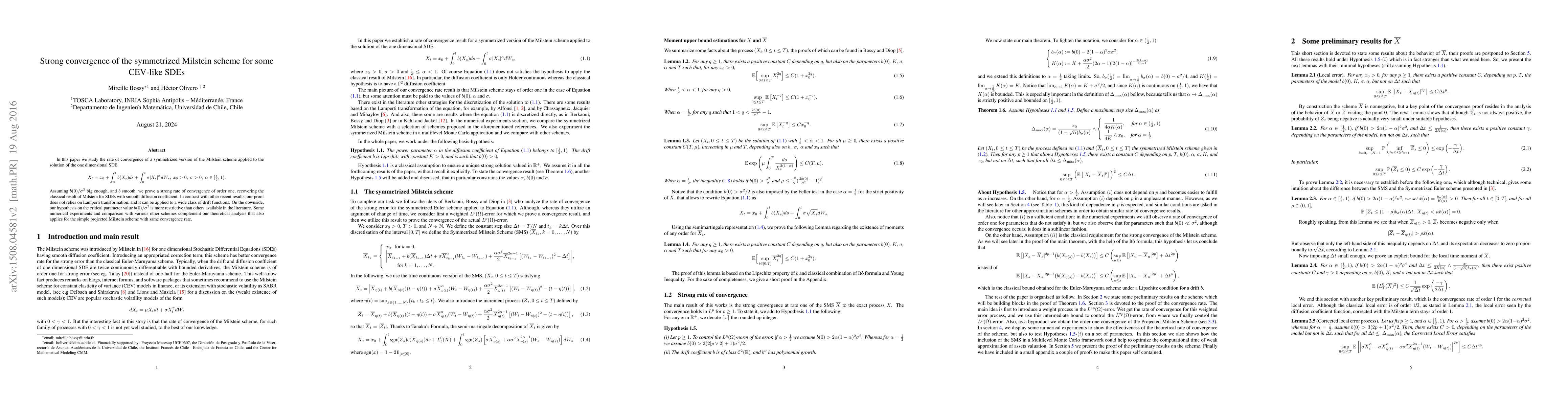 The paper studies the strong convergence rate of a symmetrized Milstein scheme applied to a specific class of SDEs, including CEV-like processes, under certain hypotheses on the drift and diffusion coefficients.