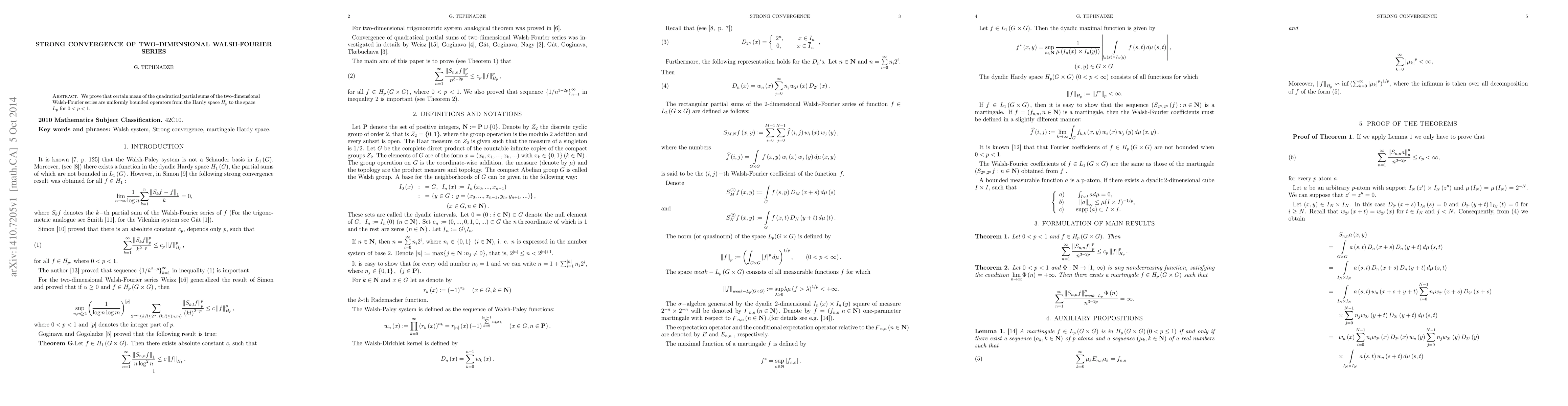 Summary: The paper demonstrates the strong convergence of two-dimensional Walsh-Fourier series by proving that certain quadratic partial sums are uniformly bounded operators from the Hardy space $H_{p}$ to $L_{p}$ for $0 < p < 1$. This establishes a significant convergence result for the series in a non-classical function space.