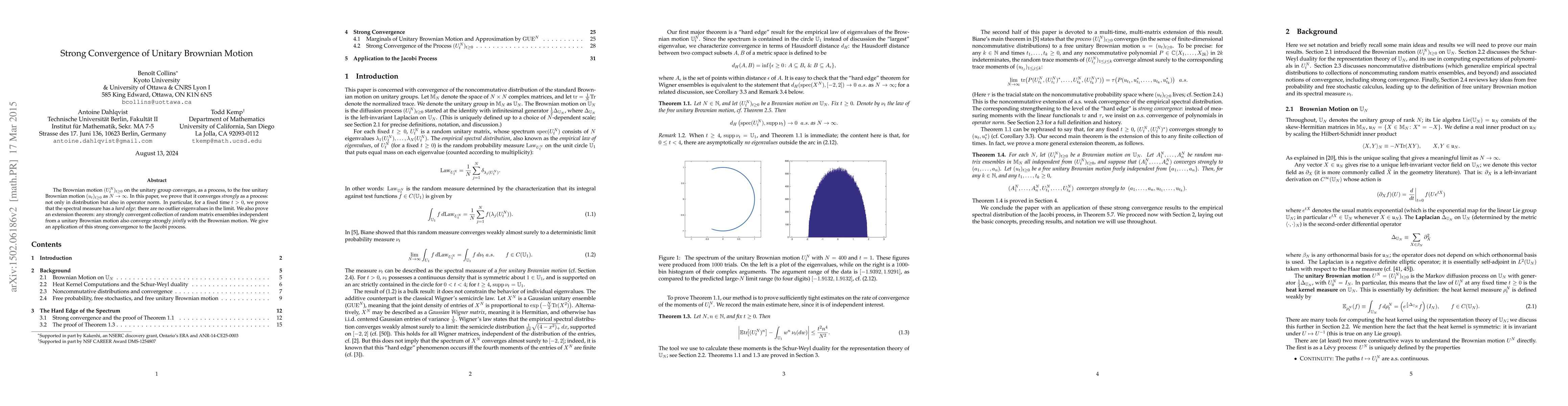 The Brownian motion $(U^N_t)_{t\ge 0}$ on the unitary group converges, as a process, to the free unitary Brownian motion $(u_t)_{t\ge 0}$ as $N\to\infty$. In this paper, we prove that it converges strongly as a process: not only in distribution but also in operator norm. In particular, for a fixed time $t>0$, we prove that the spectral measure has a hard edge: there are no outlier eigenvalues in the limit. We also prove an extension theorem: any strongly convergent collection of random matrix ensembles independent from a unitary Brownian motion also converge strongly jointly with the Brownian motion. We give an application of this strong convergence to the Jacobi process.