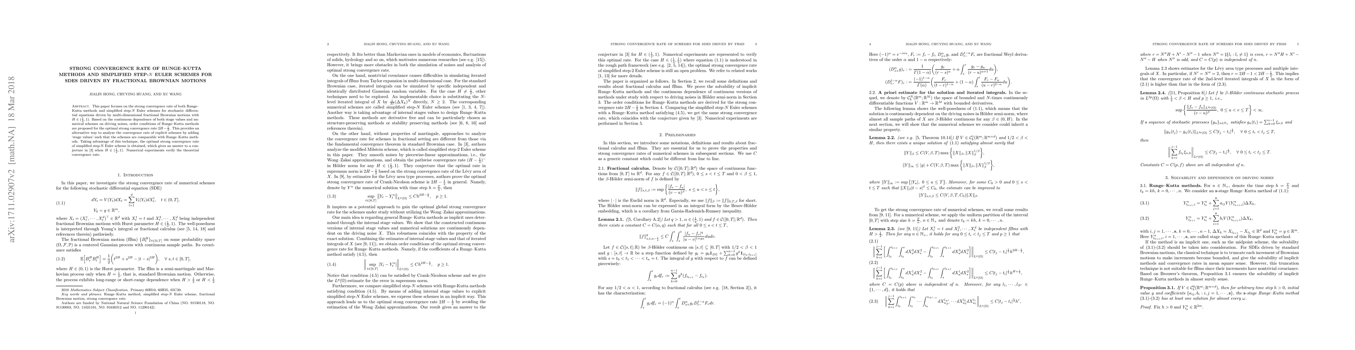 This paper investigates the strong convergence rate of Runge-Kutta methods and simplified step-$N$ Euler schemes for stochastic differential equations driven by fractional Brownian motions. It establishes the optimal strong convergence rate of $2H-\frac12$ and verifies the theoretical results with numerical experiments.