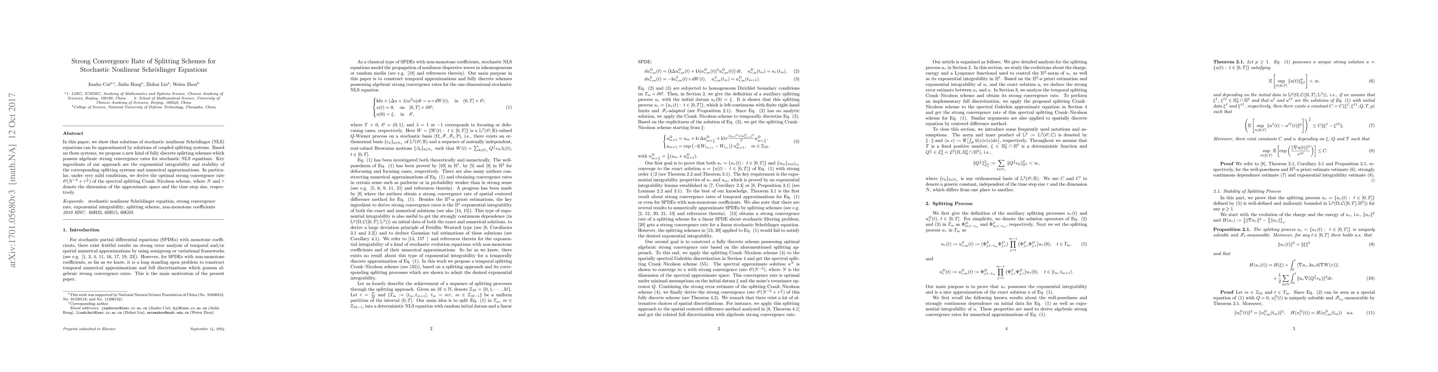 We prove the optimal strong convergence rate of a fully discrete scheme, based on a splitting approach, for a stochastic nonlinear Schr\"odinger (NLS) equation. The main novelty of our method lies on the uniform a priori estimate and exponential integrability of a sequence of splitting processes which are used to approximate the solution of the stochastic NLS equation. We show that the splitting processes converge to the solution with strong order $1/2$. Then we use the Crank--Nicolson scheme to temporally discretize the splitting process and get the temporal splitting scheme which also possesses strong order $1/2$. To obtain a full discretization, we apply this splitting Crank--Nicolson scheme to the spatially discrete equation which is achieved through the spectral Galerkin approximation. Furthermore, we establish the convergence of this fully discrete scheme with optimal strong convergence rate $\mathcal{O}(N^{-2}+\tau^\frac12)$, where $N$ denotes the dimension of the approximate space and $\tau$ denotes the time step size. To the best of our knowledge, this is the first result about strong convergence rates of temporally numerical approximations and fully discrete schemes for stochastic NLS equations, or even for stochastic partial differential equations (SPDEs) with non-monotone coefficients. Numerical experiments verify our theoretical result.