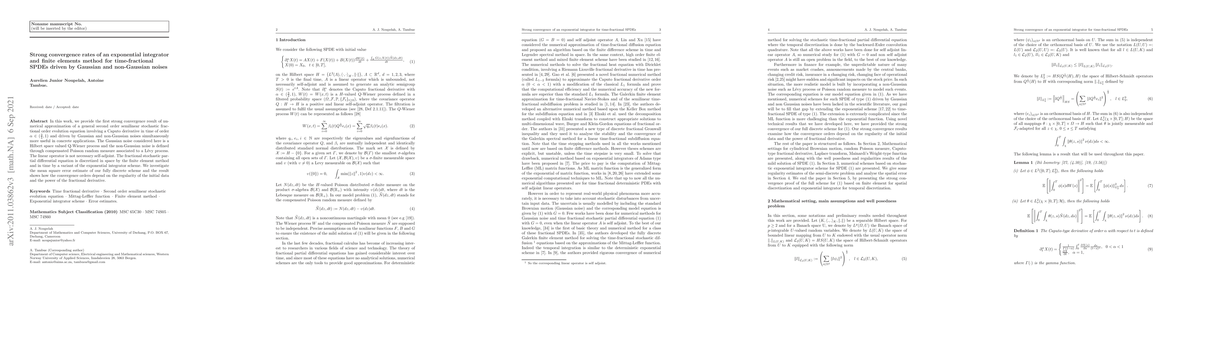 This paper presents strong convergence results for a numerical scheme combining exponential integrators and finite elements to solve time-fractional stochastic partial differential equations driven by both Gaussian and non-Gaussian noise. The study reveals mean square error estimates and convergence rates dependent on initial data regularity and the fractional derivative's order.