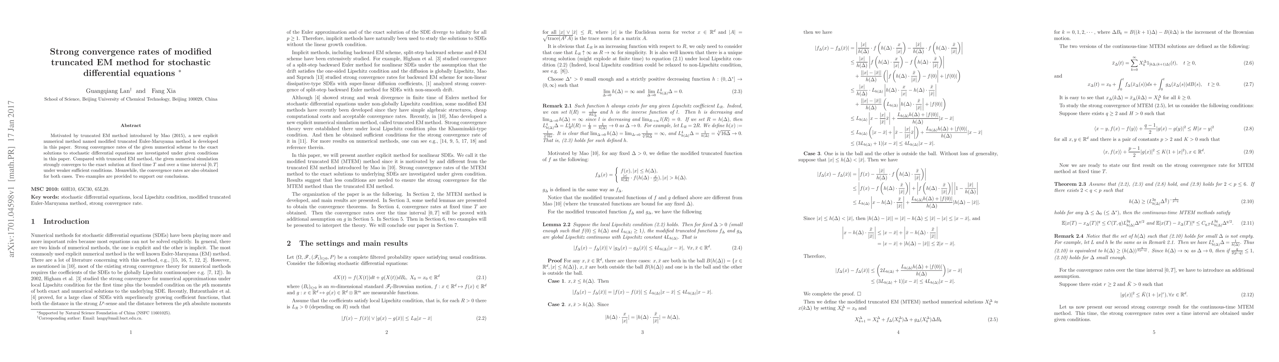 This paper develops a modified truncated Euler-Maruyama method for stochastic differential equations, demonstrating strong convergence rates under weaker conditions compared to the truncated EM method. The method achieves improved convergence both at fixed time and over intervals, with examples supporting the findings.