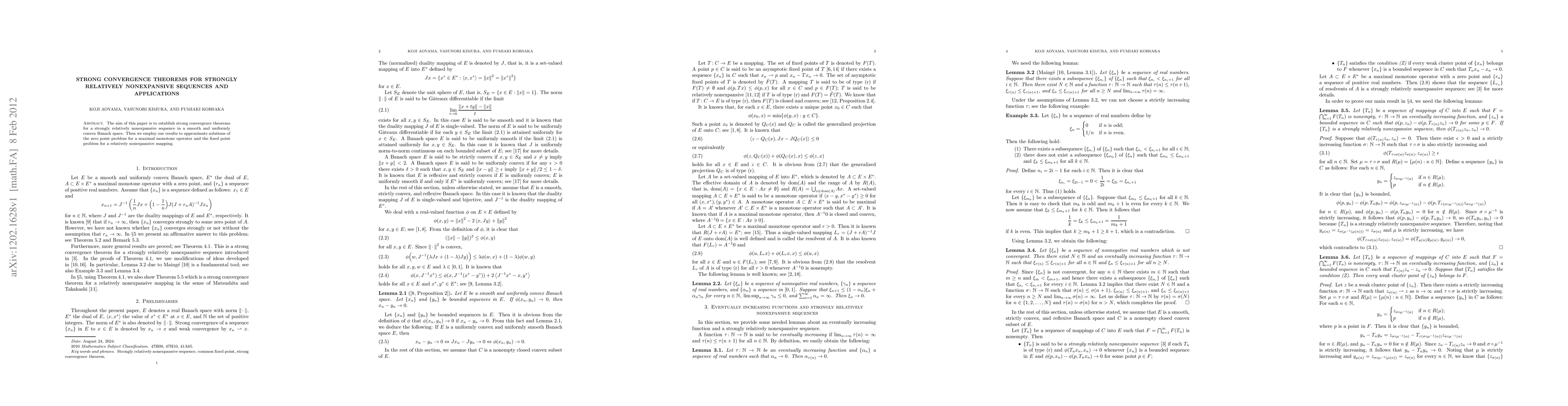 This paper proves strong convergence theorems for strongly relatively nonexpansive sequences in smooth, uniformly convex Banach spaces and applies these results to approximate solutions for maximal monotone operator zero points and fixed points for relatively nonexpansive mappings.