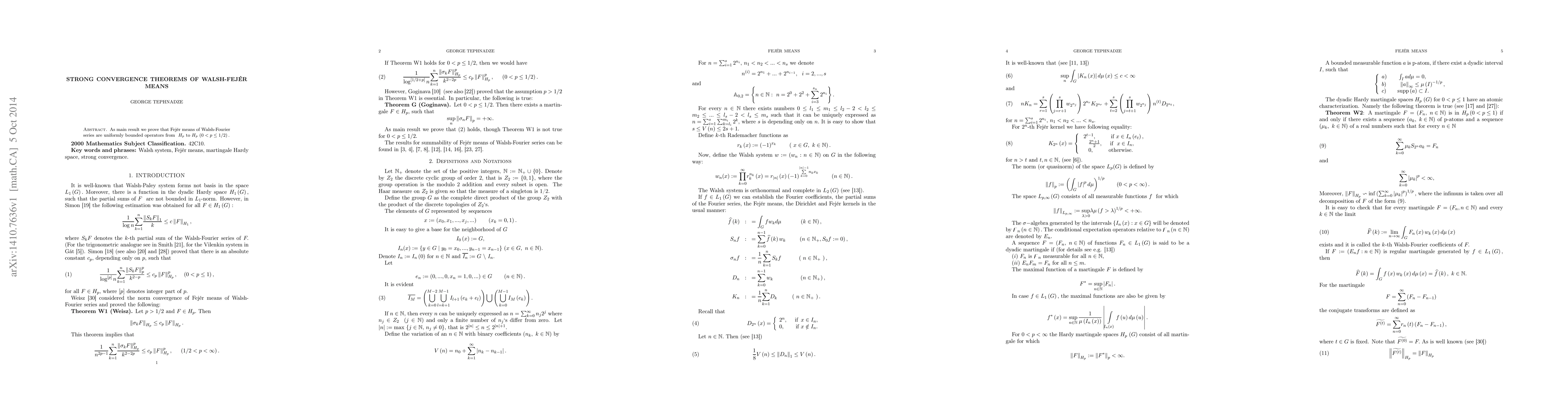 Summary: This paper proves that Fejér means of Walsh-Fourier series are uniformly bounded operators from $H_{p}$ to $H_{p}$ for $0 < p \leq 1/2$, establishing strong convergence theorems for these means.