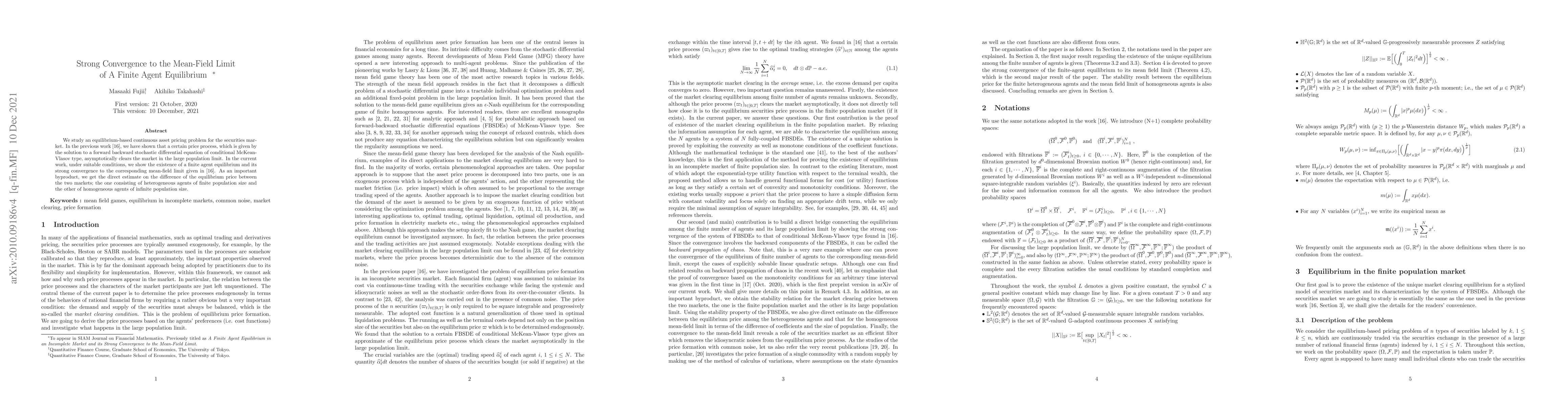We study an equilibrium-based continuous asset pricing problem for the securities market. In the previous work [16], we have shown that a certain price process, which is given by the solution to a forward backward stochastic differential equation of conditional McKean-Vlasov type, asymptotically clears the market in the large population limit. In the current work, under suitable conditions, we show the existence of a finite agent equilibrium and its strong convergence to the corresponding mean-field limit given in [16]. As an important byproduct, we get the direct estimate on the difference of the equilibrium price between the two markets; one consisting of heterogeneous agents of finite population size and the other of homogeneous agents of infinite population size.