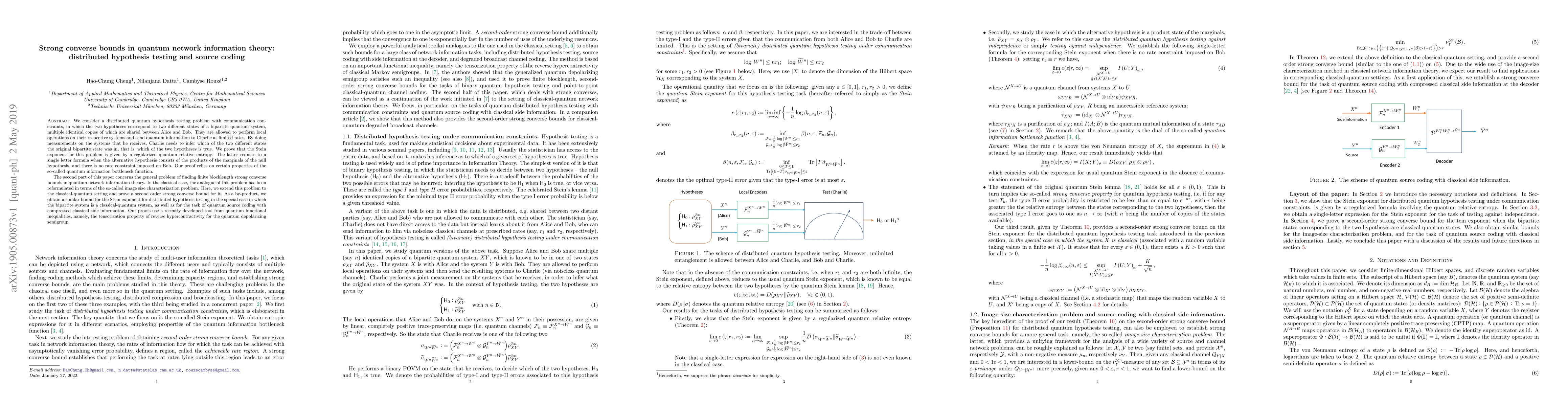 This paper establishes strong converse bounds in quantum network information theory, focusing on distributed quantum hypothesis testing under communication constraints. It proves the Stein exponent using a regularized quantum relative entropy and extends the image size characterization problem to the classical-quantum setting, deriving a second-order strong converse bound and related bounds for quantum source coding.