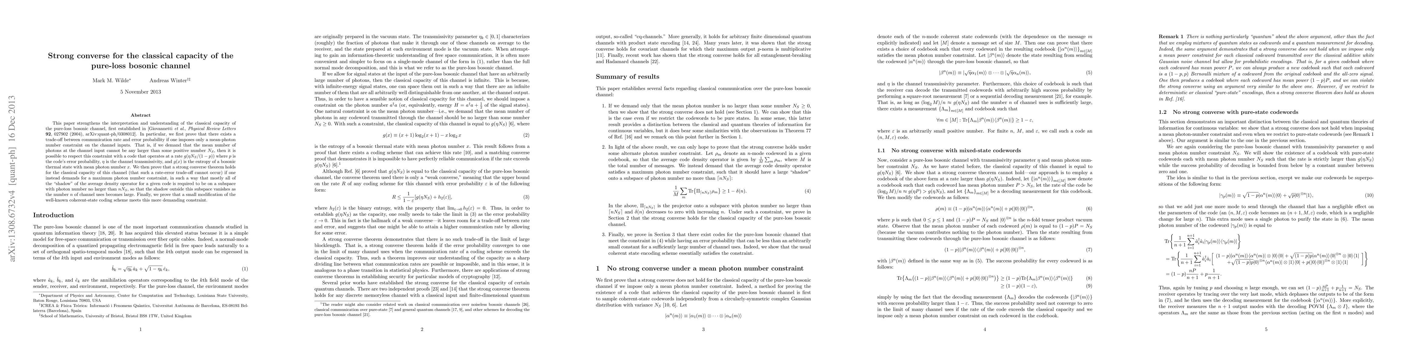 This paper strengthens the interpretation and understanding of the classical capacity of the pure-loss bosonic channel, first established in [Giovannetti et al., Physical Review Letters 92, 027902 (2004), arXiv:quant-ph/0308012]. In particular, we first prove that there exists a trade-off between communication rate and error probability if one imposes only a mean-photon number constraint on the channel inputs. That is, if we demand that the mean number of photons at the channel input cannot be any larger than some positive number N_S, then it is possible to respect this constraint with a code that operates at a rate g(\eta N_S / (1-p)) where p is the code's error probability, \eta\ is the channel transmissivity, and g(x) is the entropy of a bosonic thermal state with mean photon number x. We then prove that a strong converse theorem holds for the classical capacity of this channel (that such a rate-error trade-off cannot occur) if one instead demands for a maximum photon number constraint, in such a way that mostly all of the "shadow" of the average density operator for a given code is required to be on a subspace with photon number no larger than n N_S, so that the shadow outside this subspace vanishes as the number n of channel uses becomes large. Finally, we prove that a small modification of the well-known coherent-state coding scheme meets this more demanding constraint.