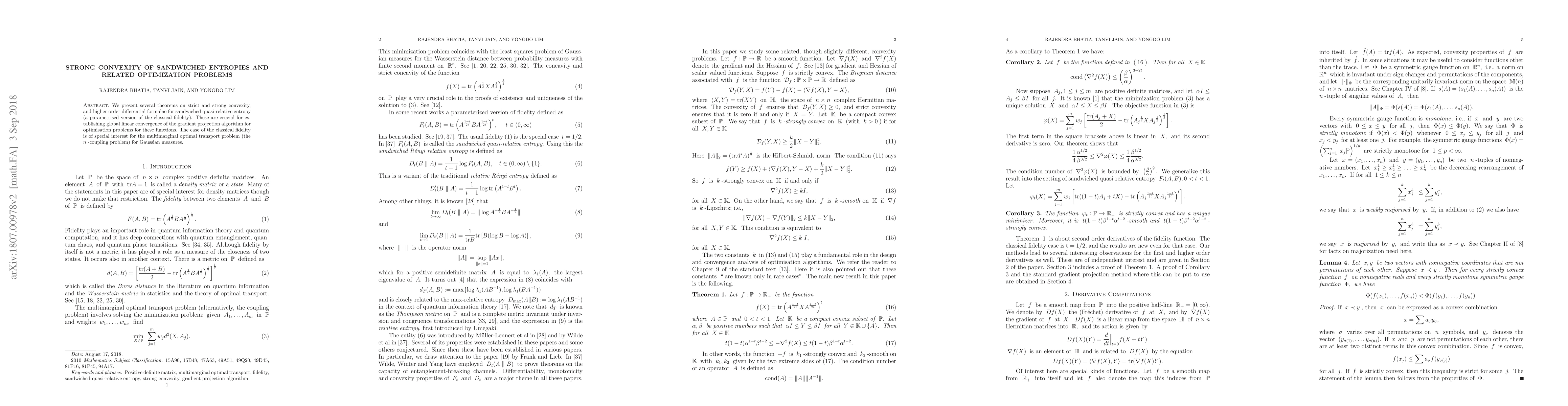 We present several theorems on strict and strong convexity, and higher order differential formulae for sandwiched quasi-relative entropy (a parametrised version of the classical fidelity). These are crucial for establishing global linear convergence of the gradient projection algorithm for optimisation problems for these functions. The case of the classical fidelity is of special interest for the multimarginal optimal transport problem (the $n$-coupling problem) for Gaussian measures.