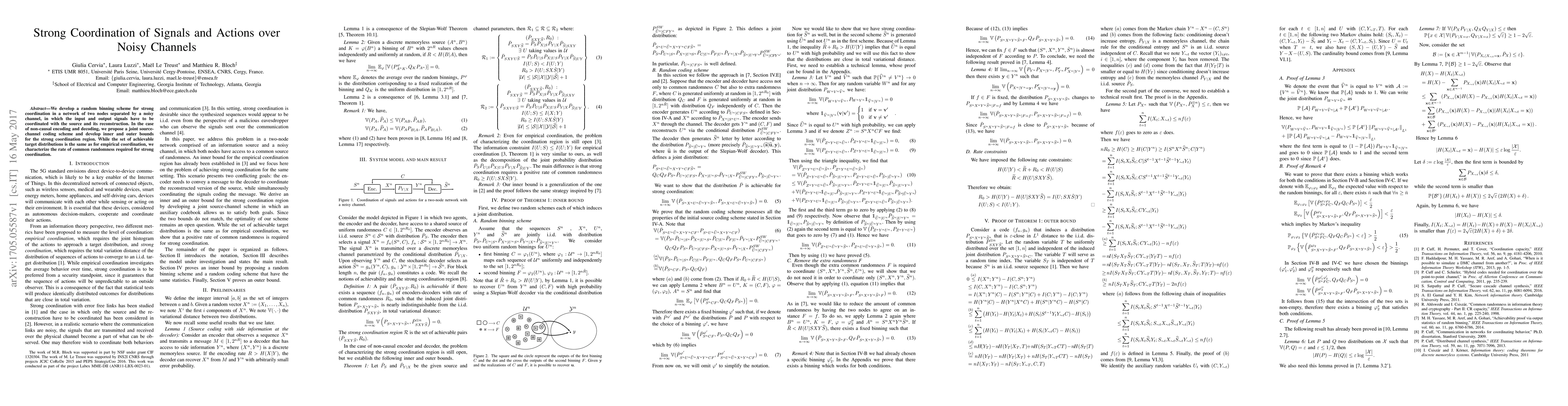 This paper proposes a random binning scheme for coordinating signals in a two-node network with a noisy channel, introducing a joint source-channel coding scheme for non-causal encoding and decoding. It characterizes the rate of common randomness required for achieving strong coordination compared to empirical methods.
