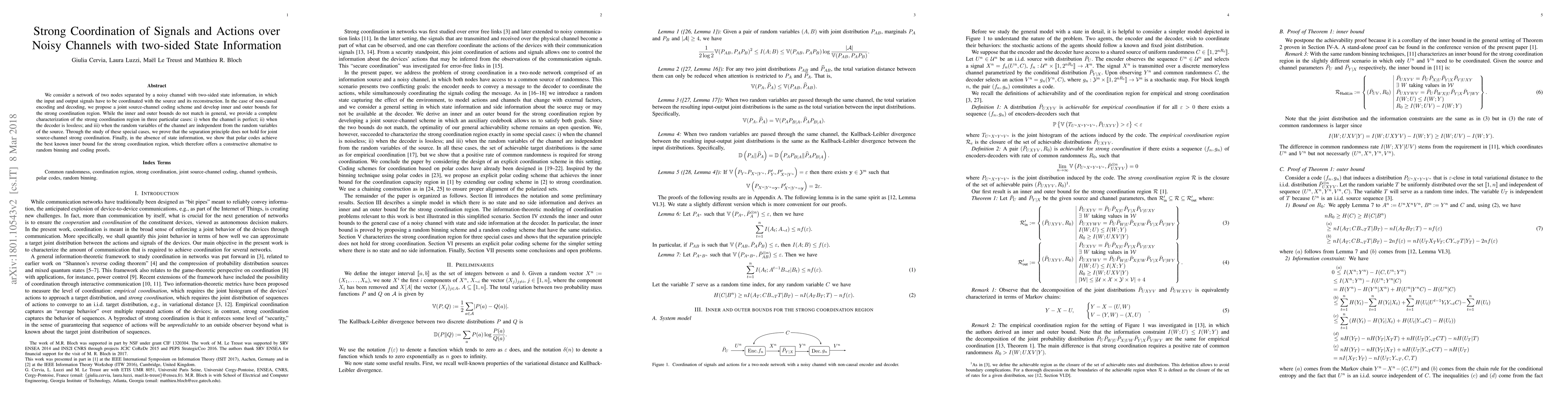 This paper proposes a joint source-channel coding scheme for coordinating signals over noisy channels with two-sided state information, developing inner and outer bounds for the strong coordination region. It demonstrates that the separation principle does not apply in general, and identifies specific cases where the coordination region is fully characterized.