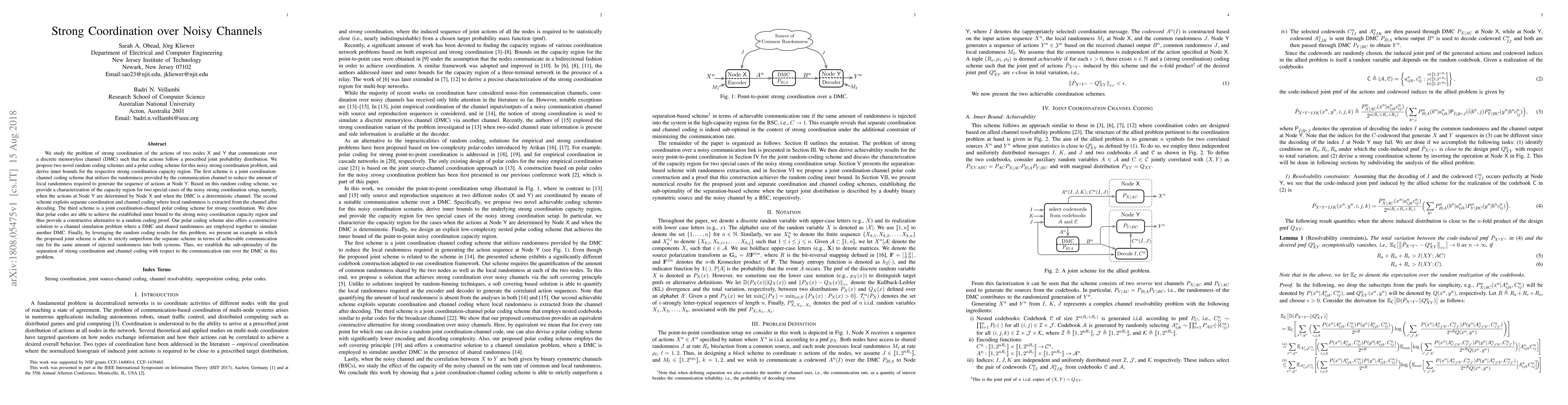 We study the problem of strong coordination of the actions of two nodes $X$ and $Y$ that communicate over a discrete memoryless channel (DMC) such that the actions follow a prescribed joint probability distribution. We propose two novel random coding schemes and a polar coding scheme for this noisy strong coordination problem, and derive inner bounds for the respective strong coordination capacity region. The first scheme is a joint coordination-channel coding scheme that utilizes the randomness provided by the DMC to reduce the amount of local randomness required to generate the sequence of actions at Node $Y$. Based on this random coding scheme, we provide a characterization of the capacity region for two special cases of the noisy strong coordination setup, namely, when the actions at Node $Y$ are determined by Node $X$ and when the DMC is a deterministic channel. The second scheme exploits separate coordination and channel coding where local randomness is extracted from the channel after decoding. The third scheme is a joint coordination-channel polar coding scheme for strong coordination. We show that polar codes are able to achieve the established inner bound to the noisy strong coordination capacity region and thus provide a constructive alternative to a random coding proof. Our polar coding scheme also offers a constructive solution to a channel simulation problem where a DMC and shared randomness are employed together to simulate another DMC. Finally, by leveraging the random coding results for this problem, we present an example in which the proposed joint scheme is able to strictly outperform the separate scheme in terms of achievable communication rate for the same amount of injected randomness into both systems. Thus, we establish the sub-optimality of the separation of strong coordination and channel coding with respect to the communication rate over the DMC.