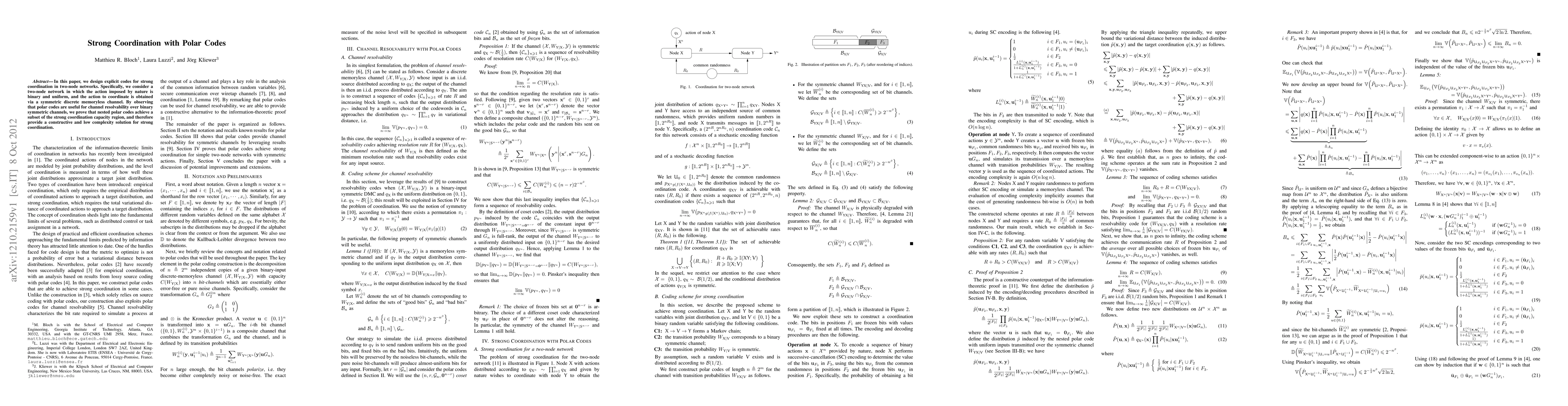 In this paper, we design explicit codes for strong coordination in two-node networks. Specifically, we consider a two-node network in which the action imposed by nature is binary and uniform, and the action to coordinate is obtained via a symmetric discrete memoryless channel. By observing that polar codes are useful for channel resolvability over binary symmetric channels, we prove that nested polar codes achieve a subset of the strong coordination capacity region, and therefore provide a constructive and low complexity solution for strong coordination.