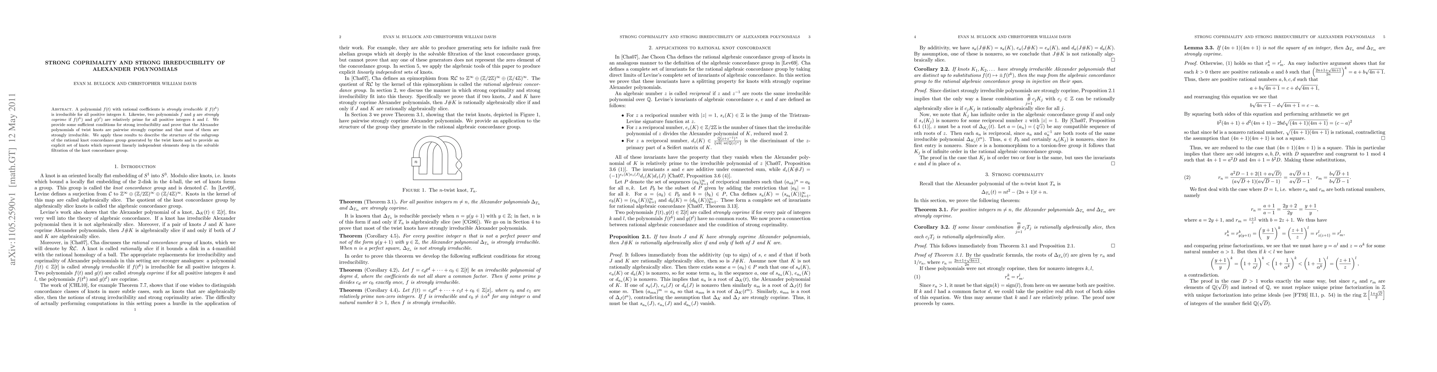 A polynomial f(t) with rational coefficients is strongly irreducible if f(t^k) is irreducible for all positive integers k. Likewise, two polynomials f and g are strongly coprime if f(t^k) and g(t^l) are relatively prime for all positive integers k and l. We provide some sufficient conditions for strong irreducibility and prove that the Alexander polynomials of twist knots are pairwise strongly coprime and that most of them are strongly irreducible. We apply these results to describe the structure of the subgroup of the rational knot concordance group generated by the twist knots and to provide an explicit set of knots which represent linearly independent elements deep in the solvable filtration of the knot concordance group.