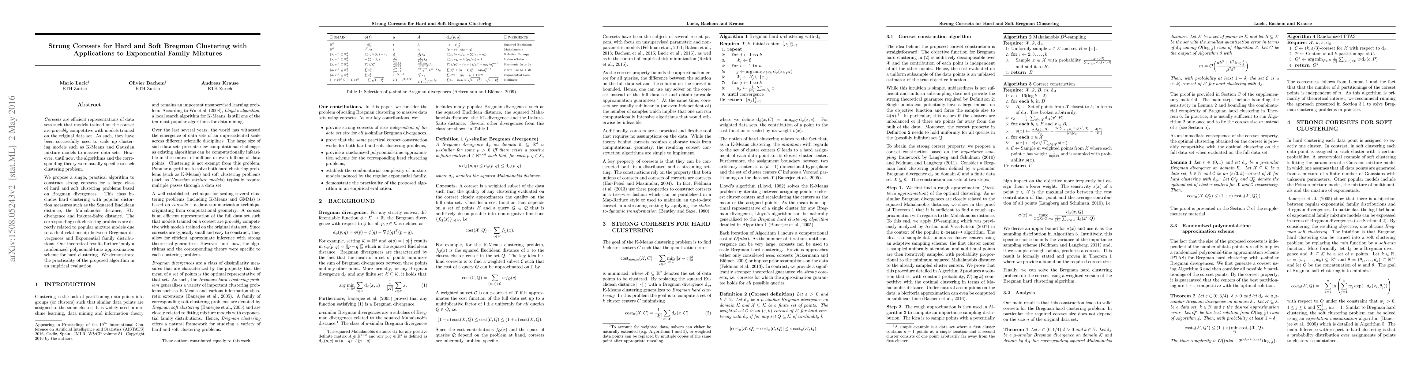 This paper proposes a unified algorithm for constructing strong coresets for both hard and soft Bregman clustering, applicable to various distortion measures and mixture models. The theoretical framework supports a randomized polynomial-time approximation scheme for hard clustering, validated through empirical evaluation.