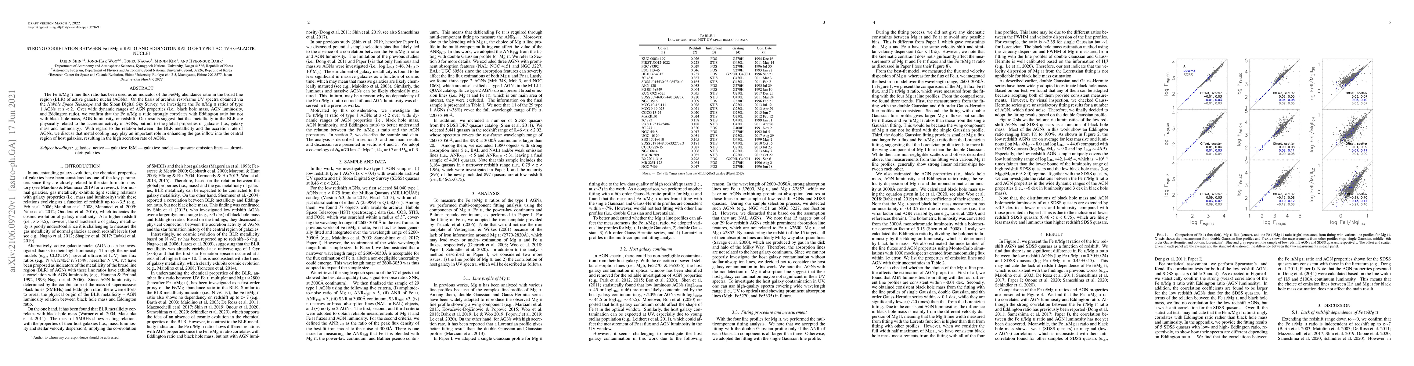 This study finds a strong correlation between the FeII/MgII line flux ratio in type 1 AGNs and their Eddington ratio, suggesting a link between BLR metallicity and AGN accretion activity. The correlation is not influenced by black hole mass, AGN luminosity, or redshift, indicating that BLR metallicity is tied to accretion processes rather than global galaxy properties.