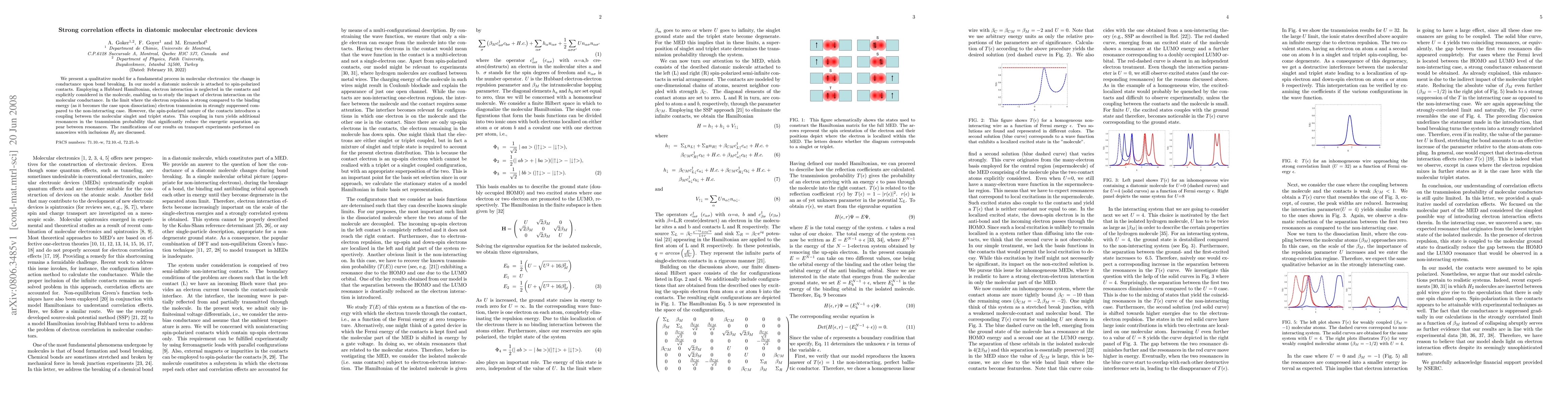 Researchers created a model to study how bond breaking affects conductance in molecular electronics devices. They found that electron interaction reduces transmission and introduces additional resonances that reduce the energetic separation between them.