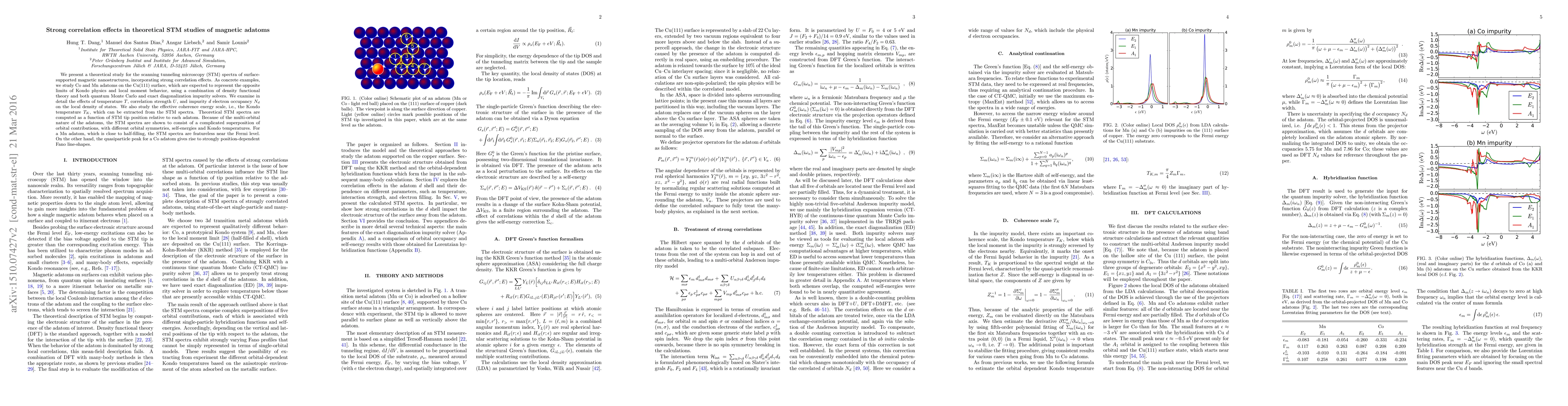 This paper investigates the scanning tunneling microscopy (STM) spectra of magnetic Co and Mn adatoms on Cu(111) using strong correlation effects, revealing complex superpositions of orbital contributions and distinct STM spectral features influenced by temperature, correlation strength, and electron occupancy. The study highlights the Kondo temperature's role in determining the adatoms' local density of states.