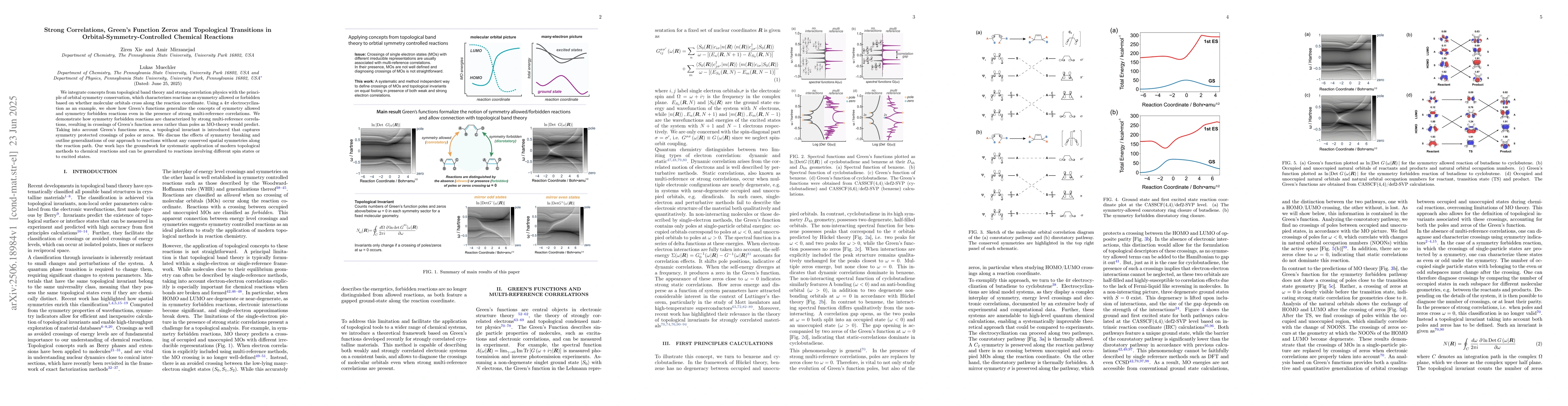 We integrate concepts from topological band theory and strong-correlation physics with the principle of orbital symmetry conservation, which characterizes reactions as symmetry allowed or forbidden based on whether molecular orbitals cross along the reaction coordinate. Using a $4\pi$ electrocyclization as an example, we show how Green's functions generalize the concepts of symmetry allowed and symmetry forbidden reactions even in the presence of strong multi-reference correlations. We demonstrate how symmetry forbidden reactions are characterized by strong multi-reference correlations, resulting in crossings of Green's function zeros rather than poles as MO-theory would predict. Taking into account Green's functions zeros, a topological invariant is introduced that captures symmetry protected crossings of poles or zeros. We discuss the effects of symmetry breaking and outline generalizations of our approach to reactions without any conserved spatial symmetries along the reaction path. Our work lays the groundwork for systematic application of modern topological methods to chemical reactions and can be generalized to reactions involving different spin states or to excited states.