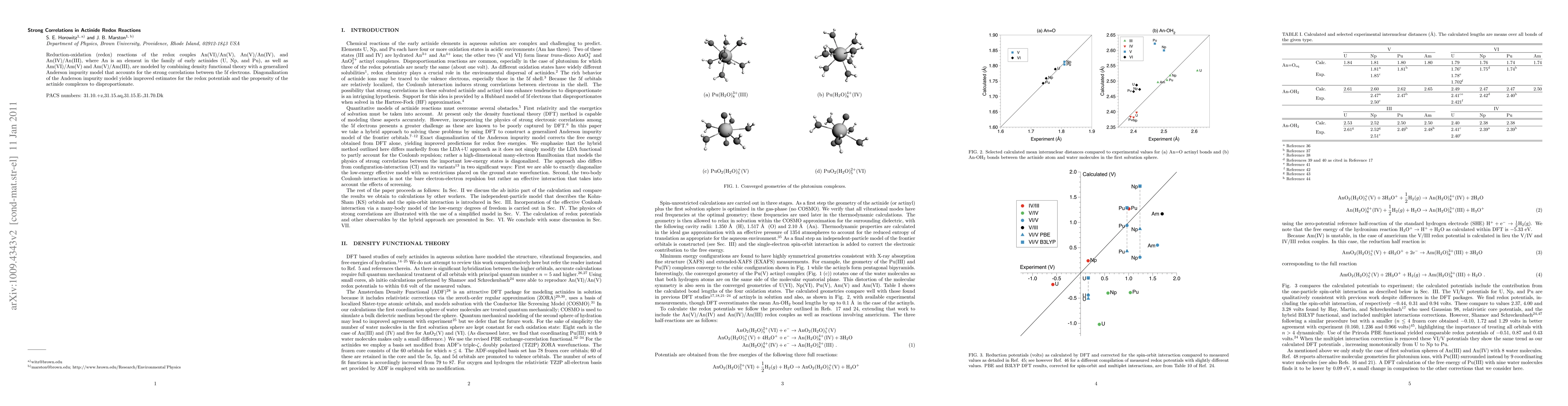 Reduction-oxidation (redox) reactions of the redox couples An(VI)/An(V), An(V)/An(IV), and An(IV)/An(III), where An is an element in the family of early actinides (U, Np, and Pu), as well as Am(VI)/Am(V) and Am(V)/Am(III), are modeled by combining density functional theory with a generalized Anderson impurity model that accounts for the strong correlations between the 5f electrons. Diagonalization of the Anderson impurity model yields improved estimates for the redox potentials and the propensity of the actinide complexes to disproportionate.
