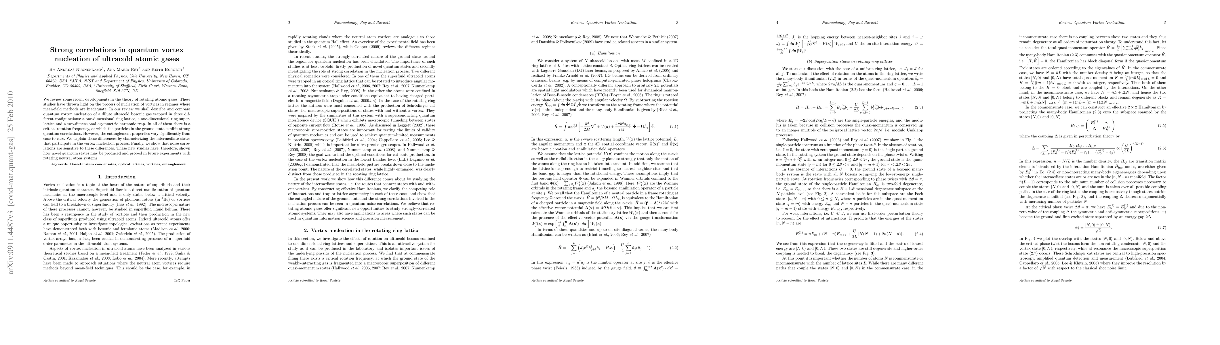 We review some recent developments in the theory of rotating atomic gases. These studies have thrown light on the process of nucleation of vortices in regimes where mean-field methods are inadequate. In our review we shall describe and compare quantum vortex nucleation of a dilute ultracold bosonic gas trapped in three different configurations: a one-dimensional ring lattice, a one-dimensional ring superlattice and a two-dimensional asymmetric harmonic trap. In all of them there is a critical rotation frequency, at which the particles in the ground state exhibit strong quantum correlations. However, the entanglement properties vary significantly from case to case. We explain these differences by characterizing the intermediate states that participate in the vortex nucleation process. Finally, we show that noise correlations are sensitive to these differences. These new studies have, therefore, shown how novel quantum states may be produced and probed in future experiments with rotating neutral atom systems.