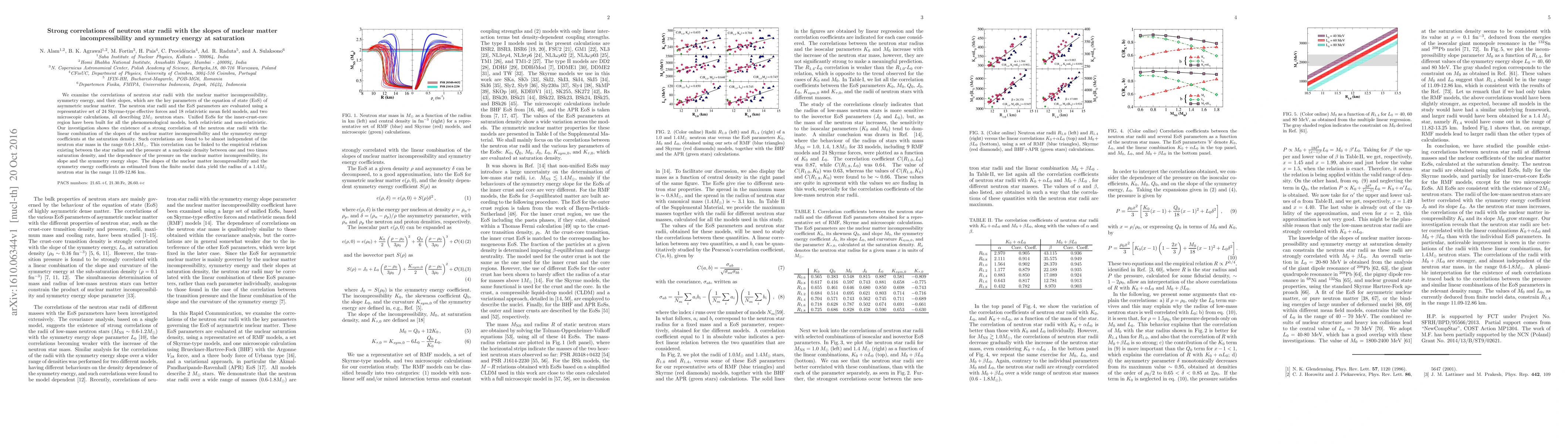 This paper investigates strong correlations between neutron star radii and the slopes of nuclear matter incompressibility and symmetry energy at saturation density, using various theoretical models. It finds a consistent relationship between neutron star radii and these nuclear parameters, independent of star mass, which can be linked to the pressure at nucleonic densities between one and two times saturation density.