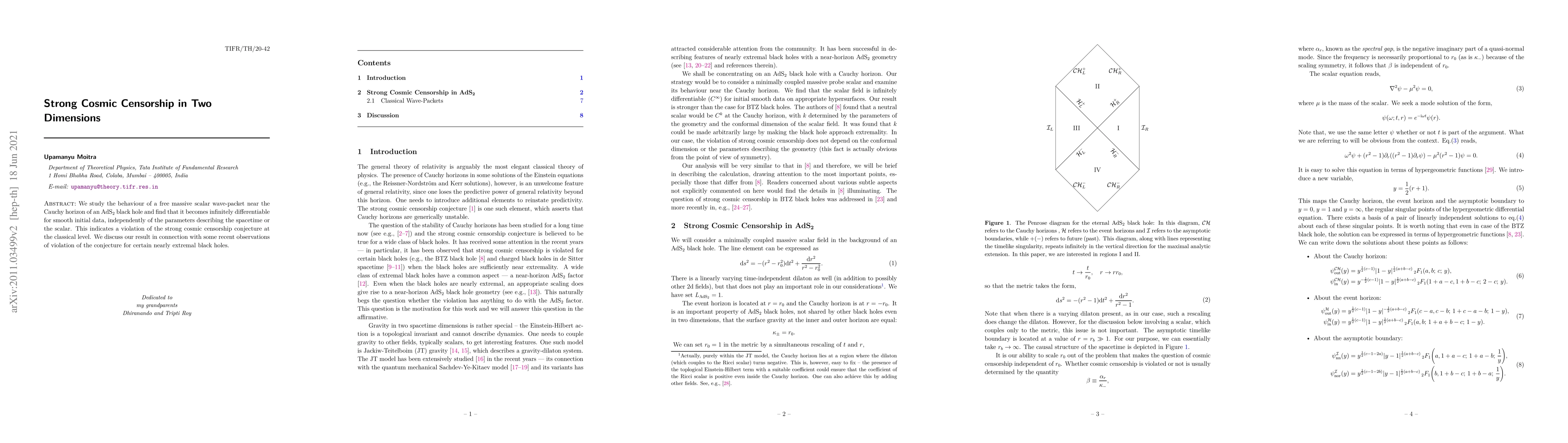 This paper investigates the behavior of a scalar wave-packet near the Cauchy horizon of a 2D AdS black hole, revealing it becomes infinitely differentiable for smooth initial data, thus violating the strong cosmic censorship conjecture classically. The findings align with recent observations of similar violations in nearly extremal black holes.