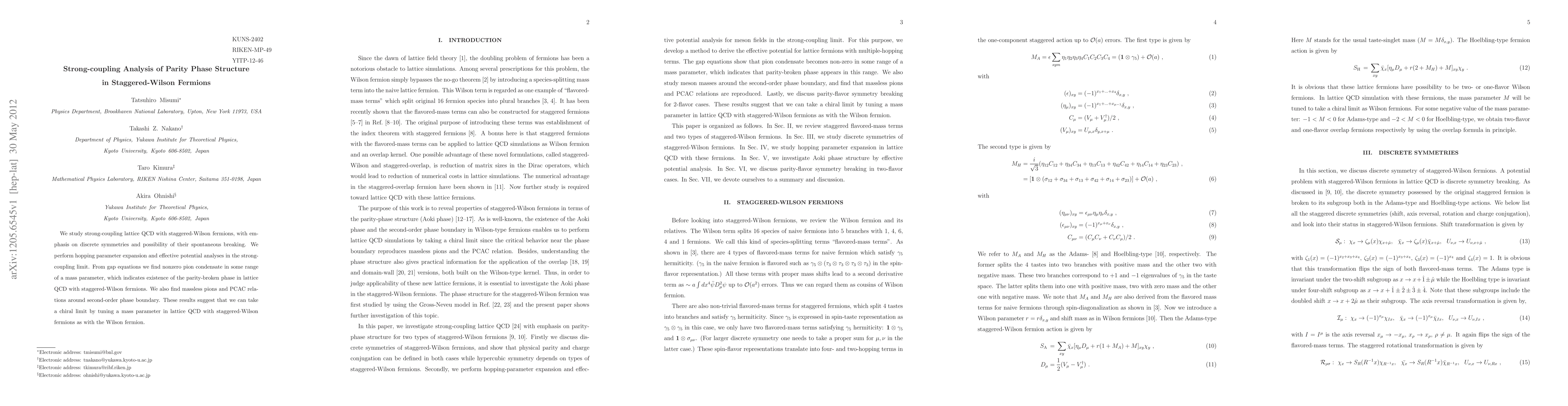 This study investigates strong-coupling lattice QCD using staggered-Wilson fermions, revealing a nonzero pion condensate indicating a parity-broken phase. The analysis also finds massless pions and PCAC relations near the second-order phase boundary, suggesting a chiral limit can be achieved by adjusting a mass parameter.