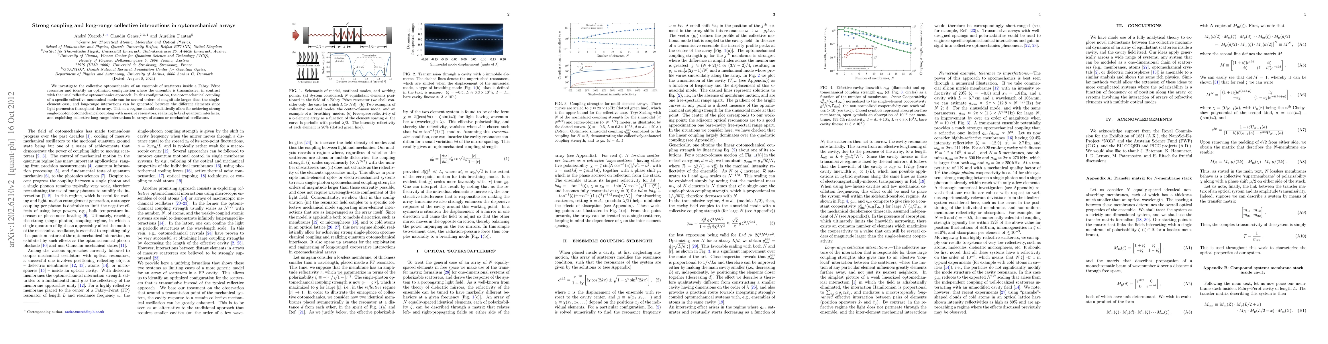 This paper explores the collective optomechanics in an array of scatterers within a Fabry-Perot resonator, revealing an optimized transmissive configuration that enhances optomechanical coupling by several orders of magnitude compared to single elements, enabling strong single-photon interactions and long-range collective effects.
