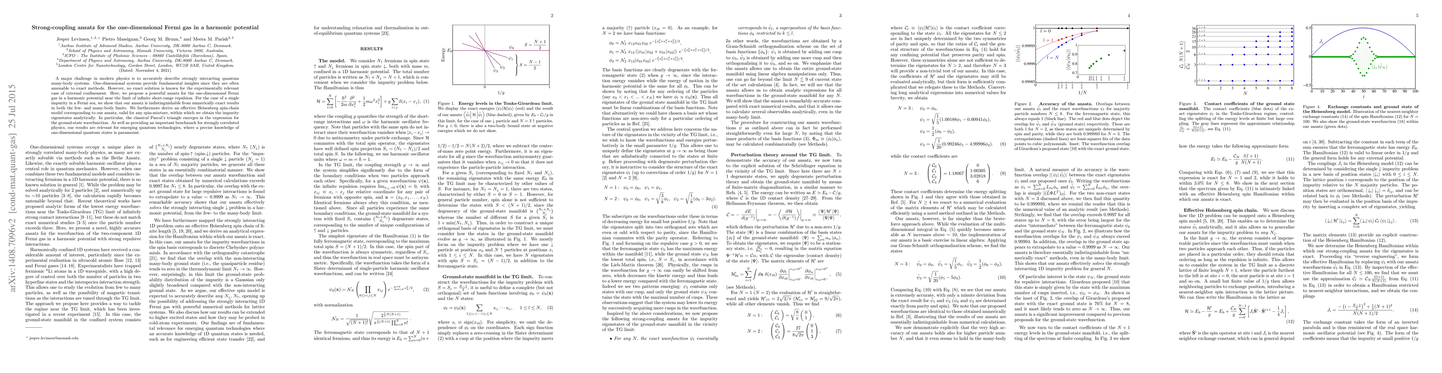 This paper proposes a strong-coupling ansatz for describing one-dimensional Fermi gases in a harmonic potential, demonstrating its accuracy against numerically exact results. It also derives an effective Heisenberg spin-chain model, revealing analytical expressions for impurity eigenstates and the emergence of Pascal's triangle in the ground-state wavefunction.