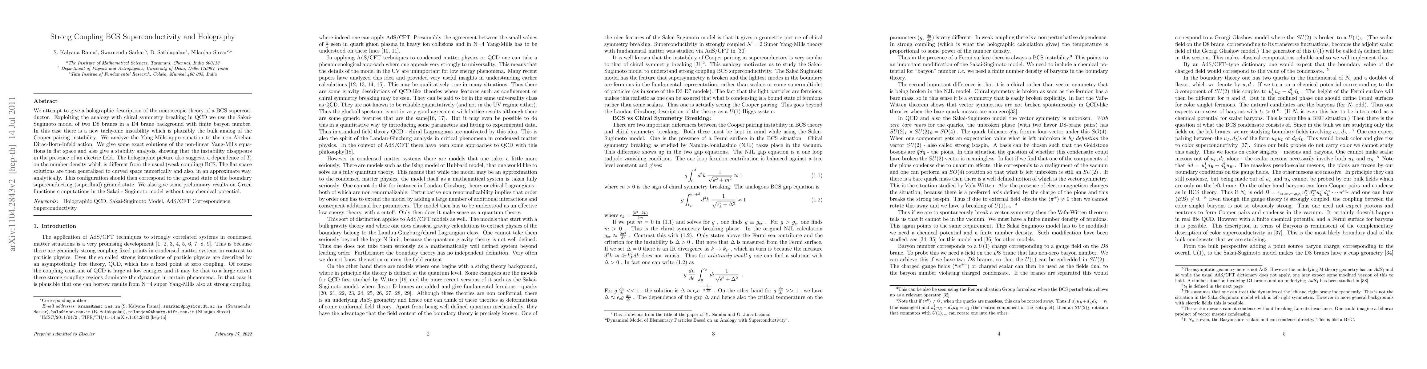 We attempt to give a holographic description of the microscopic theory of a BCS superconductor. Exploiting the analogy with chiral symmetry breaking in QCD we use the Sakai-Sugimoto model of two D8 branes in a D4 brane background with finite baryon number. In this case there is a new tachyonic instability which is plausibly the bulk analog of the Cooper pairing instability. We analyze the Yang-Mills approximation to the non-Abelian Born-Infeld action. We give some exact solutions of the non-linear Yang-Mills equations in flat space and also give a stability analysis, showing that the instability disappears in the presence of an electric field. The holograhic picture also suggests a dependence of $T_c$ on the number density which is different from the usual (weak coupling) BCS. The flat space solutions are then generalized to curved space numerically and also, in an approximate way, analytically. This configuration should then correspond to the ground state of the boundary superconducting (superfluid) ground state. We also give some preliminary results on Green functions computations in the Sakai - Sugimoto model without any chemical potential