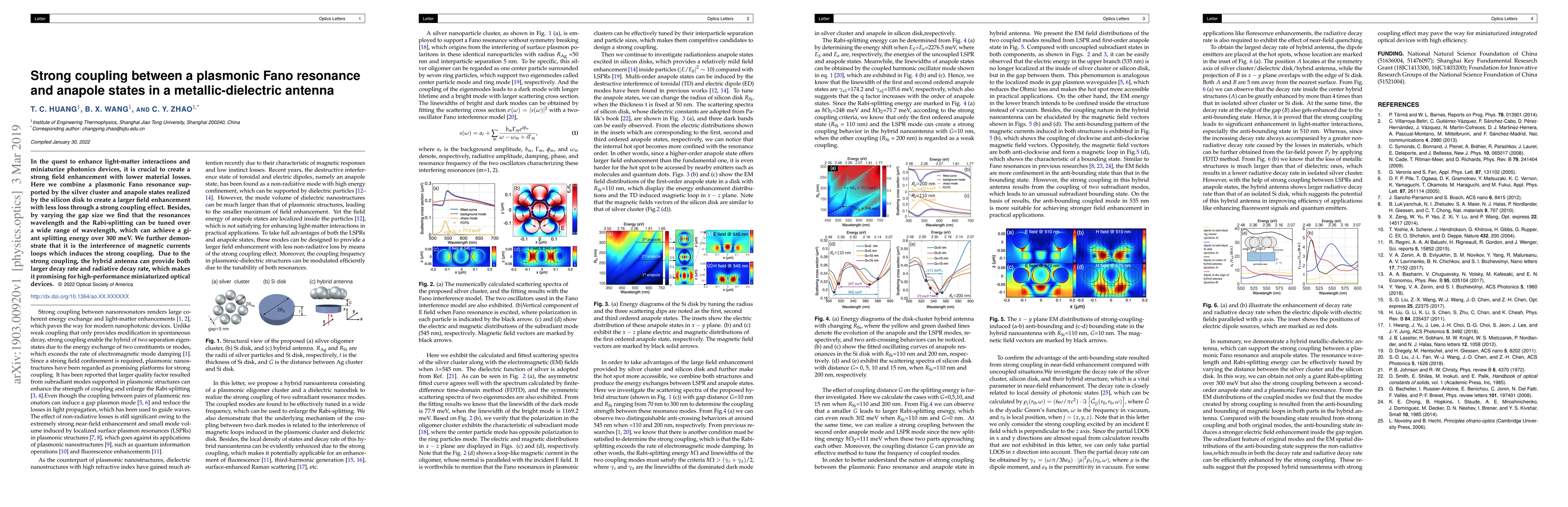 In the quest to enhance light-matter interactions and miniaturize photonics devices, it is crucial to create a strong field enhancement with lower material losses. Here we combine a plasmonic Fano resonance supported by the silver cluster and anapole states realized by the silicon disk to create a larger field enhancement with less loss through a strong coupling effect. Besides, by varying the gap size we find that the resonances wavelength and the Rabi-splitting can be tuned over a wide range of wavelength, which can achieve a giant splitting energy over 300 meV. We further demonstrate that it is the interference of magnetic currents loops which induces the strong coupling. Due to the strong coupling, the hybrid antenna can provide both larger decay rate and radiative decay rate, which makes it promising for high-performance miniaturized optical devices.
