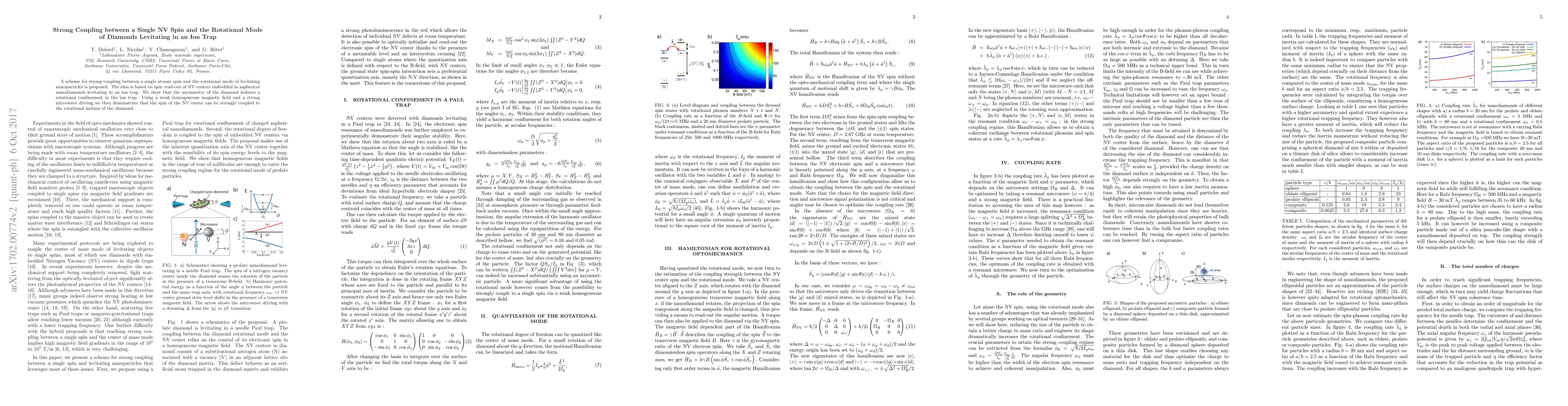 This research proposes a method for strong coupling between a single NV spin and the rotational mode of levitating nanodiamonds in an ion trap, utilizing the asymmetry of the diamond to induce rotational confinement. The study demonstrates that the NV center's spin can be strongly coupled to the diamond's rotational motion through spin read-out and microwave driving.