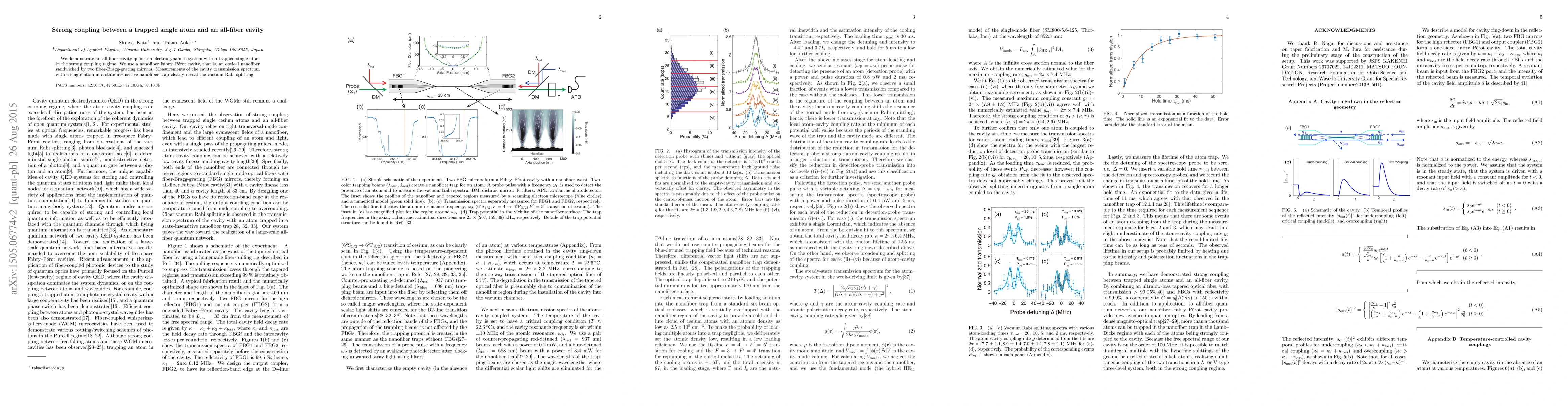 The research utilizes a nanofiber Fabry-Perot cavity formed by two fiber-Bragg-grating mirrors, trapping a single atom in a state-insensitive trap. Measurements of cavity transmission spectra reveal vacuum Rabi splitting, indicating strong coupling.