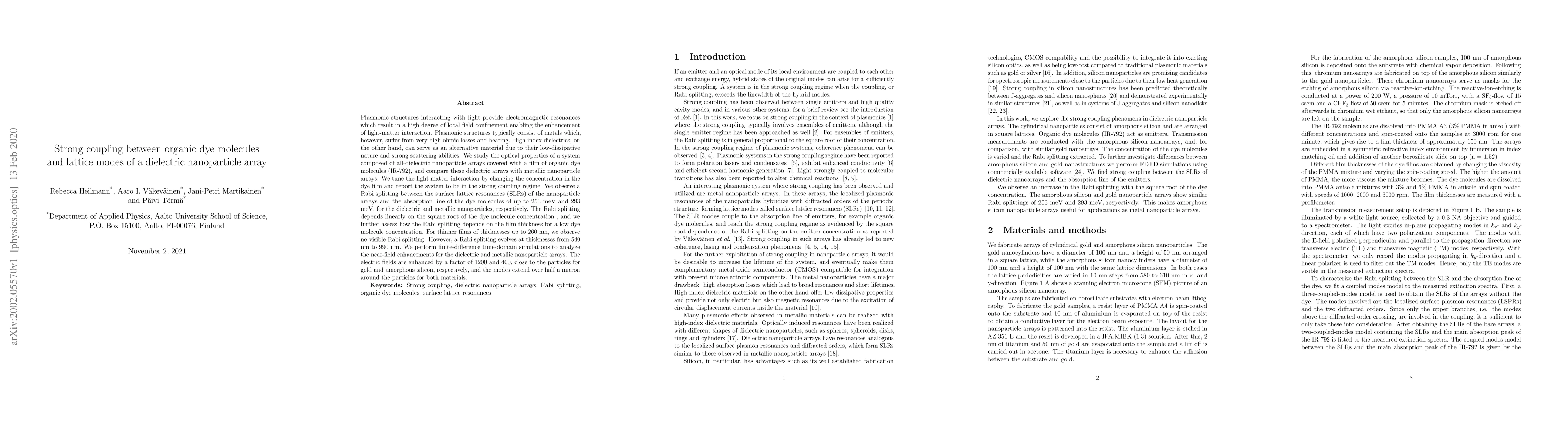 This paper investigates the strong coupling between organic dye molecules and lattice modes in dielectric nanoparticle arrays, demonstrating significant light-matter interaction enhancement compared to metallic counterparts. The study observes Rabi splitting up to 293 meV in metallic nanoparticles, and up to 253 meV in dielectric arrays, highlighting the potential of dielectric materials for low-loss applications.