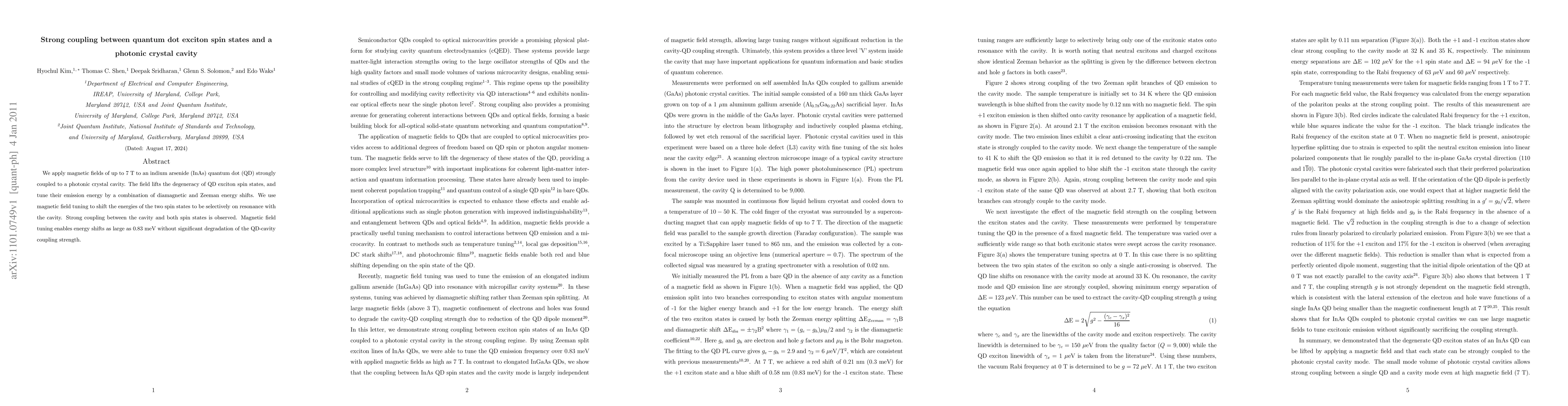 This paper demonstrates strong coupling between the spin states of an InAs quantum dot and a photonic crystal cavity under magnetic fields up to 7 T, achieving significant energy shifts without degrading the coupling strength. The magnetic field tunes the exciton spin states' emission energies, enabling selective resonance with the cavity.