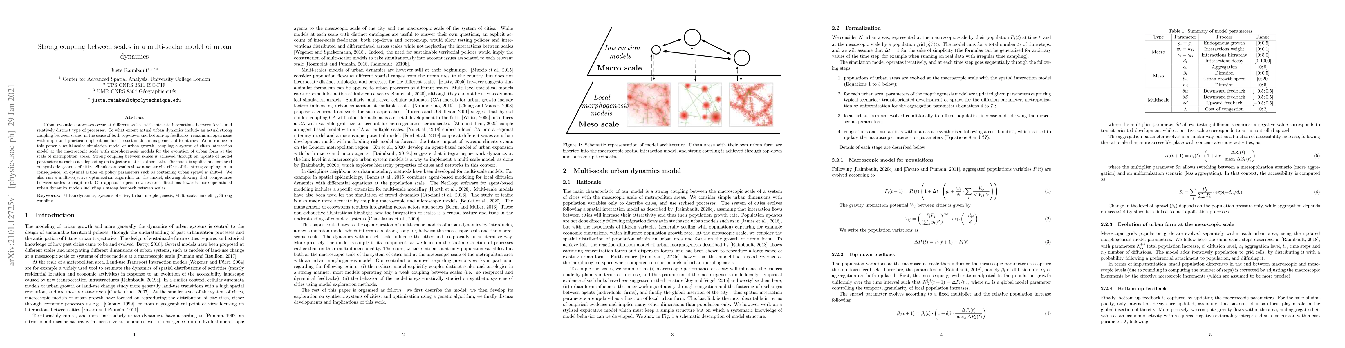 This paper introduces a multi-scalar simulation model to explore strong coupling between different scales in urban dynamics, demonstrating that such coupling significantly impacts policy outcomes like urban sprawl containment. The model integrates city-level interactions with metropolitan-scale morphogenesis, revealing the importance of feedback mechanisms between scales for sustainable urban management.