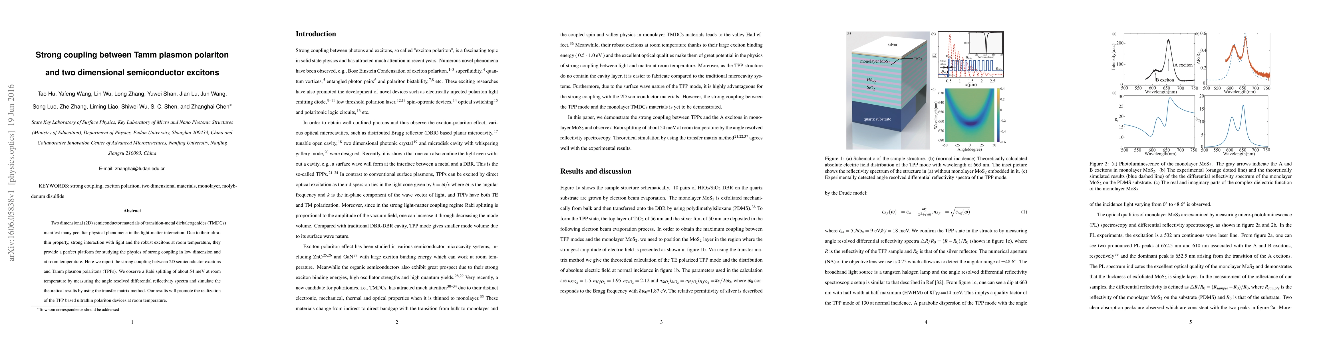 This paper reports strong coupling between 2D semiconductor excitons and Tamm plasmon polaritons in transition-metal dichalcogenides, achieving a Rabi splitting of 54 meV at room temperature, which can facilitate the development of ultrathin polariton devices. Theoretical simulations using the transfer matrix method support the observed strong coupling.