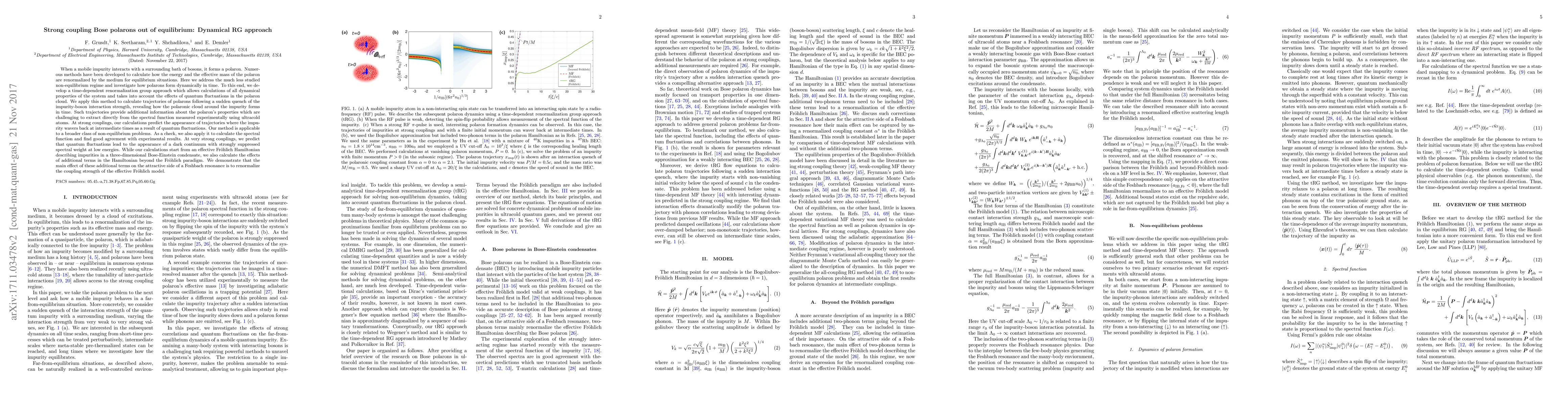 When a mobile impurity interacts with a surrounding bath of bosons, it forms a polaron. Numerous methods have been developed to calculate how the energy and the effective mass of the polaron are renormalized by the medium for equilibrium situations. Here we address the much less studied non-equilibrium regime and investigate how polarons form dynamically in time. To this end, we develop a time-dependent renormalization group approach which allows calculations of all dynamical properties of the system and takes into account the effects of quantum fluctuations in the polaron cloud. We apply this method to calculate trajectories of polarons following a sudden quench of the impurity-boson interaction strength, revealing how the polaronic cloud around the impurity forms in time. Such trajectories provide additional information about the polaron's properties which are challenging to extract directly from the spectral function measured experimentally using ultracold atoms. At strong couplings, our calculations predict the appearance of trajectories where the impurity wavers back at intermediate times as a result of quantum fluctuations. Our method is applicable to a broader class of non-equilibrium problems. We also apply it to calculate the spectral function and find good agreement with experimental results. At very strong couplings, we predict that quantum fluctuations lead to the appearance of a dark continuum with strongly suppressed spectral weight at low energies. While our calculations start from an effective Fr\"ohlich Hamiltonian describing impurities in a three-dimensional Bose-Einstein condensate, we also calculate the effects of additional terms in the Hamiltonian beyond the Fr\"ohlich paradigm. We demonstrate that the main effect of these additional terms on the attractive side of a Feshbach resonance is to renormalize the coupling strength of the effective Fr\"ohlich model.